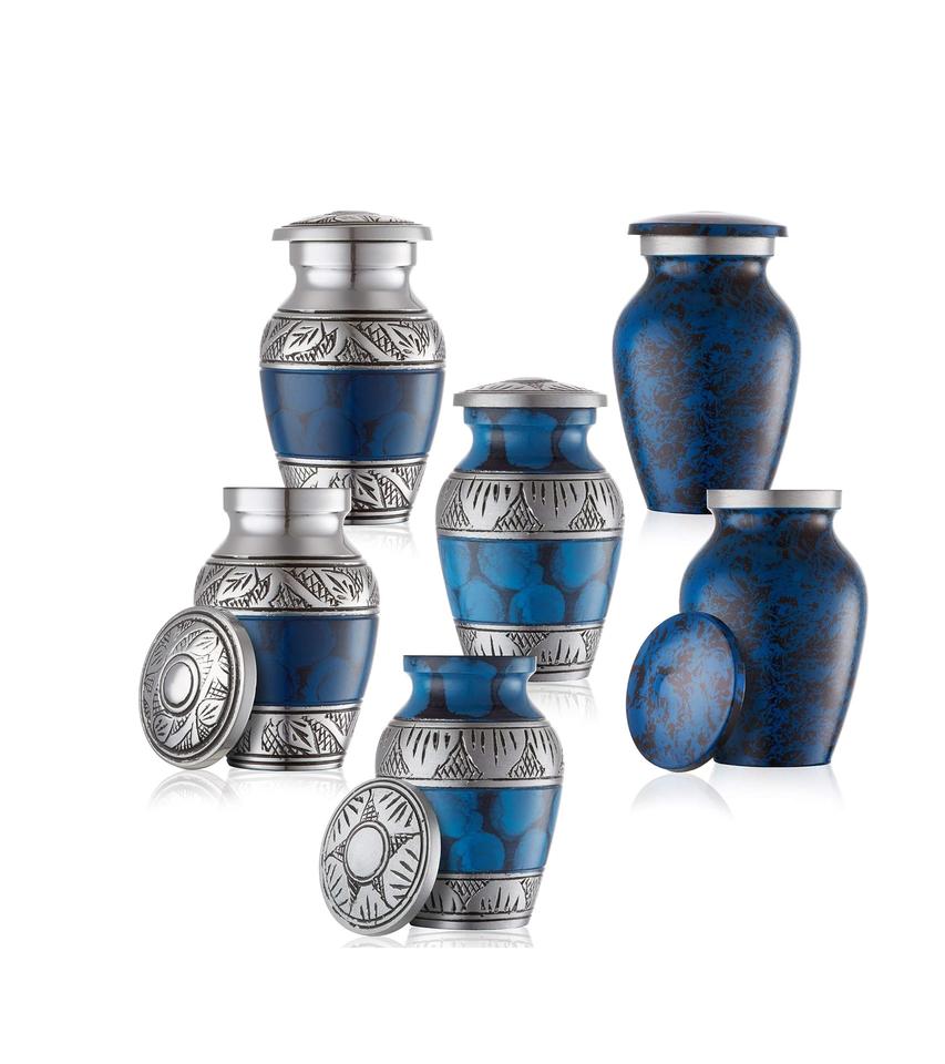 โกศเพลิงศพขนาดเล็กสําหรับเถ้ามนุษย์ ชุดของที่ระลึกขนาดเล็ก 6 ชิ้น สีน้ําเงินและสีเงิน พร้อมกล่องกํามะหยี่
