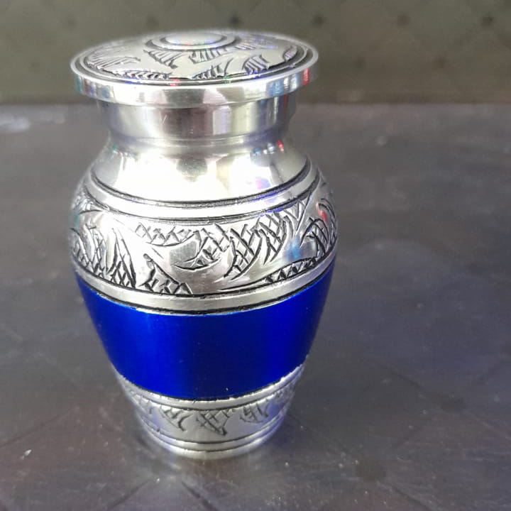 ของที่ระลึกเล็กๆน้อยๆสำหรับขี้เถ้ามนุษย์พร้อมถุงกำมะหยี่และปล่องเก็บความร้อนทองเหลืองสีฟ้าพร้อมแผ่นนิกเกิลโดย ayaans