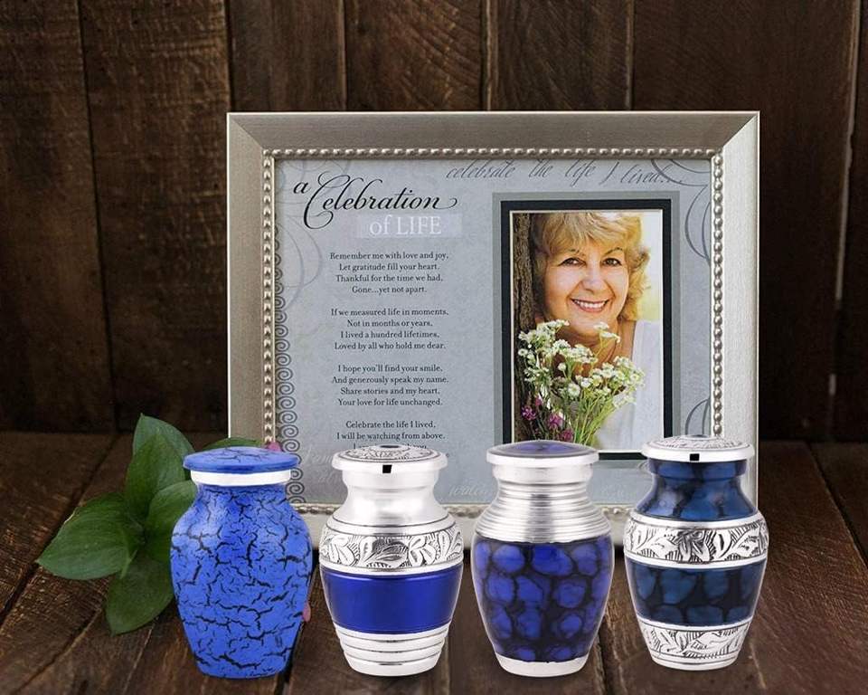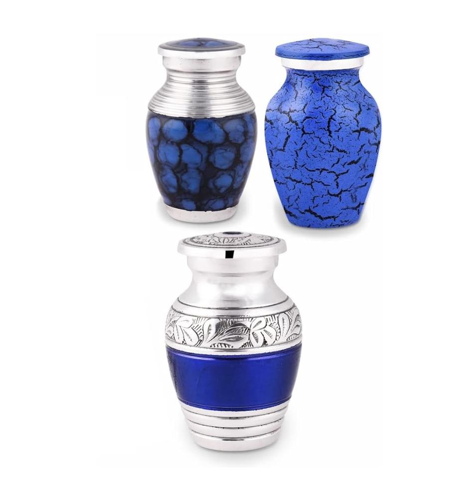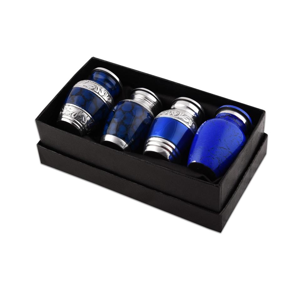 โกศที่ระลึกขนาดเล็ก | สําหรับเถ้ามนุษย์หรือเถ้าสัตว์เลี้ยง | เบอร์นมินิออร์นสีน้ําเงินเข้มแห่งสวรรค์ ชุด 4 | โกศสูง 3" และ 4 ชิ้นส่วน