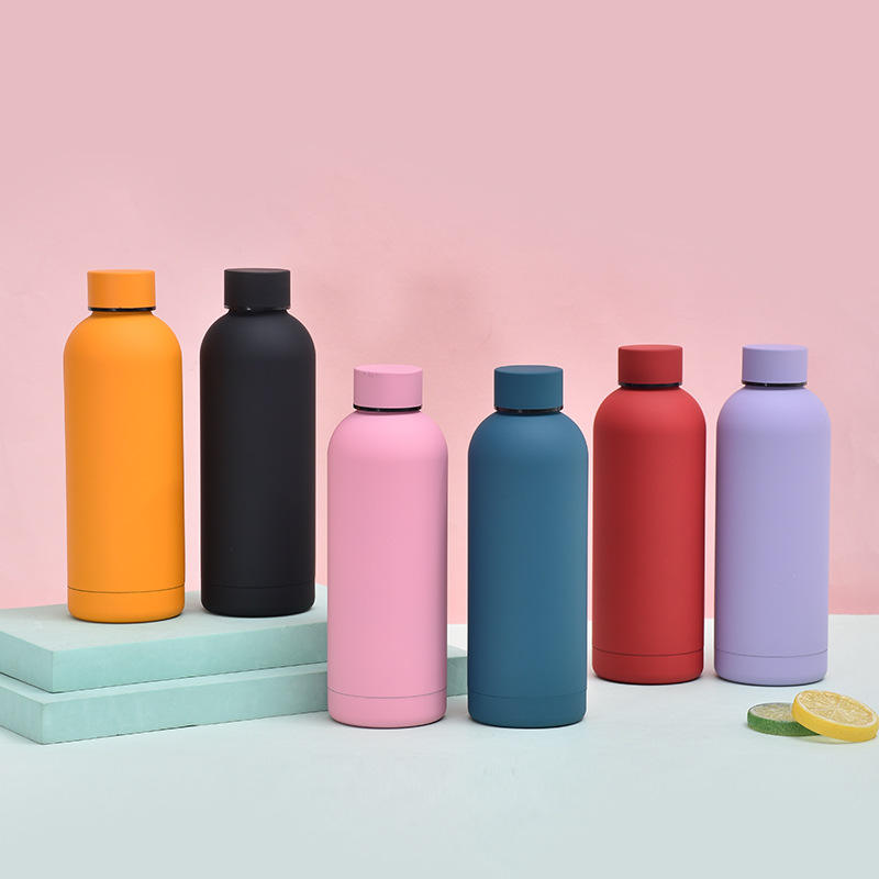 ขวดน้ำสแตนเลสสองชั้นแบบกำหนดโลโก้เองได้ MOQ ต่ำ พร้อมเคลือบยางสัมผัสนุ่ม กระติกน้ำเก็บความร้อนสุญญากาศ
