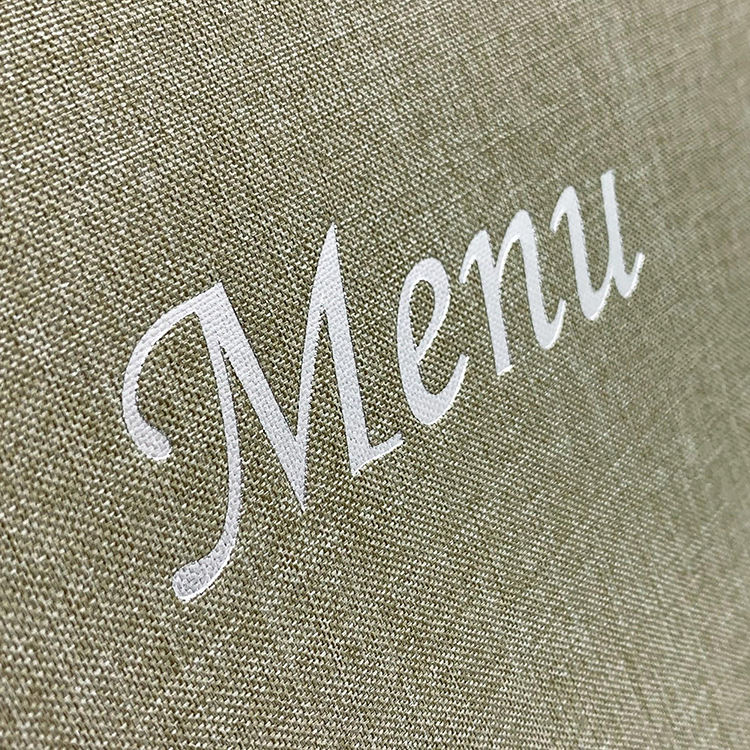 ที่ใส่เมนูร้านอาหารผ้าคุณภาพสูง MOQ ต่ำ ปกเมนูผ้าลินิน 2 หน้า พร้อมห่วงร้อย