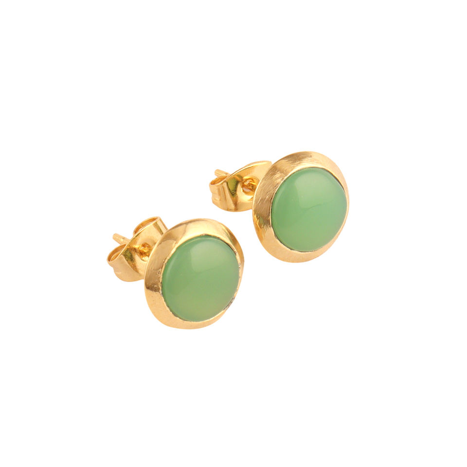กระดุมอัญมณีทรงหลังเบี้ยคู่เล็กทรงกลมต่างหูแบบหมุดปักรูปแคลเซโดนีสีเขียวต่างหูชุบทอง18K สำหรับผู้หญิง