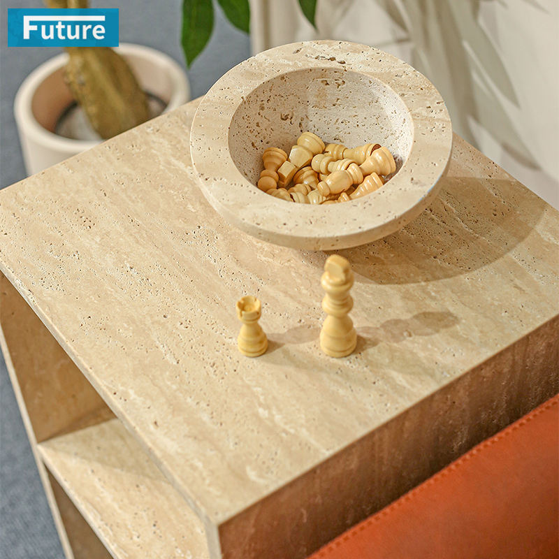 โต๊ะข้างเตียงโซฟาหินธรรมชาติขนาดเล็ก100% สีเบจ Travertine เฟอร์นิเจอร์ห้องนั่งเล่นสไตล์ Wabi