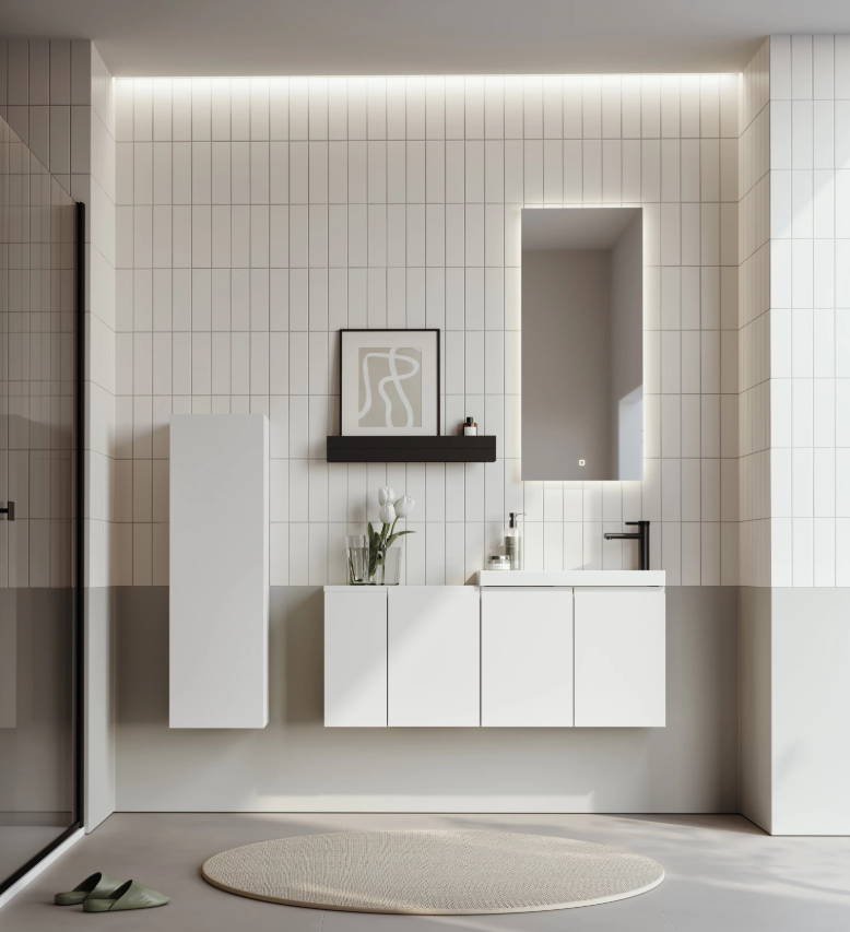 ตู้ห้องน้ำขนาดเล็กพร้อมลิ้นชัก Ferla และอ่างล้างหน้าขนาดเล็ก