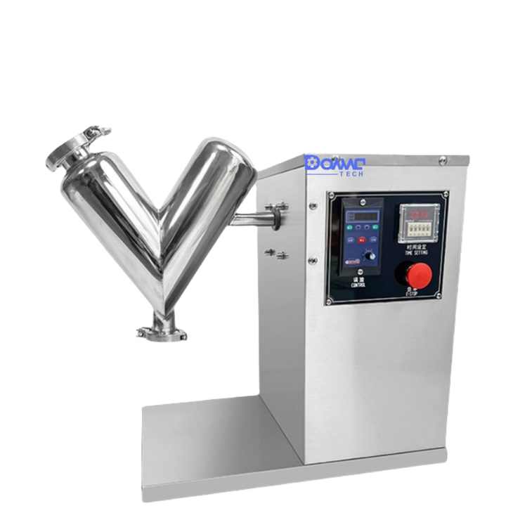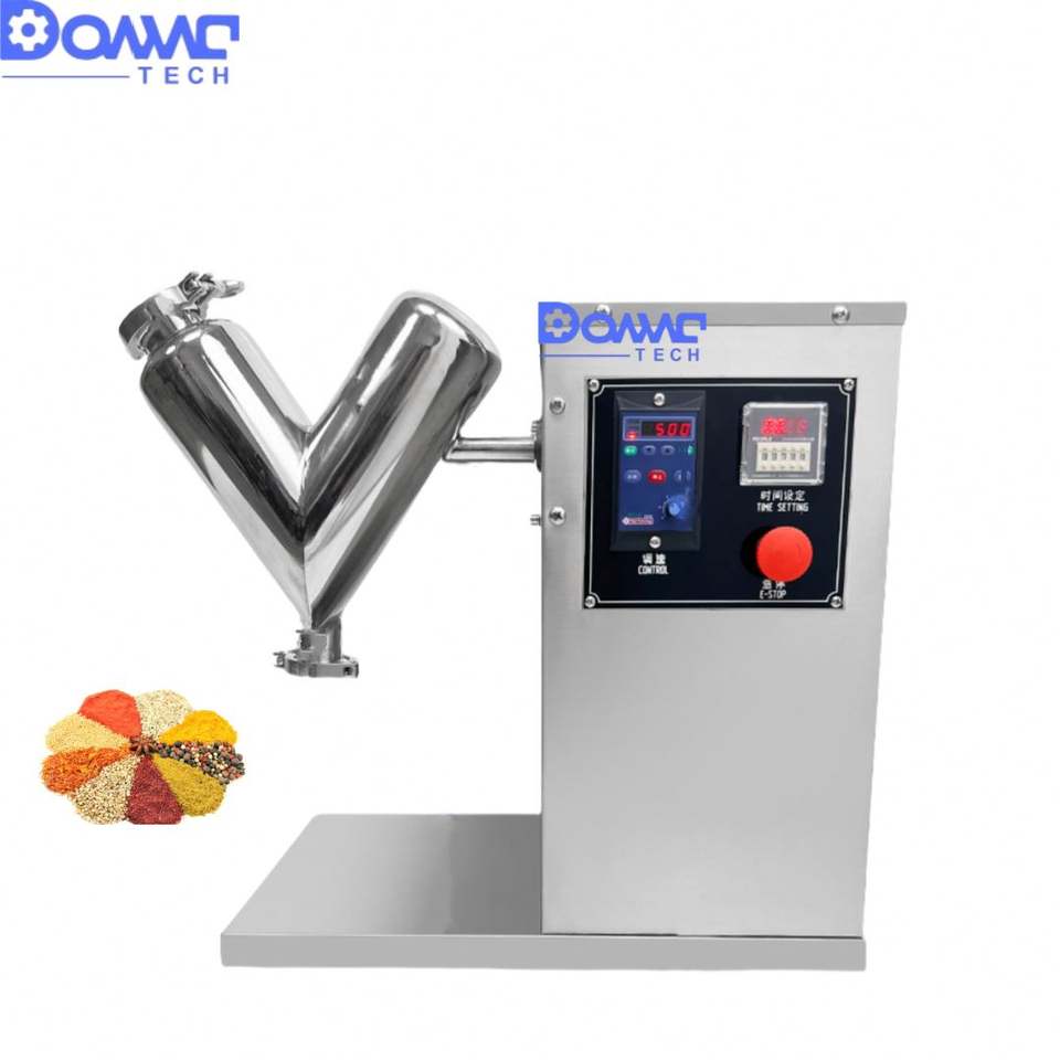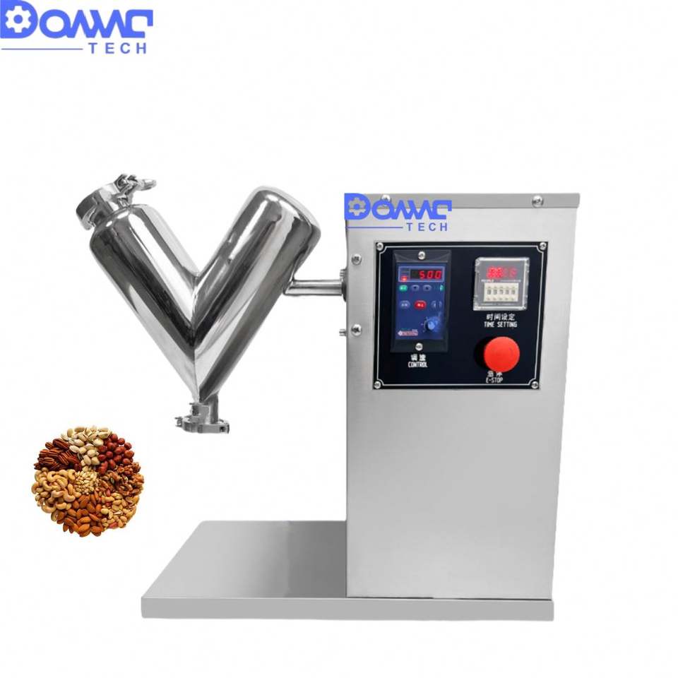 เครื่องผสมอาหารเคมีแบบ V ขนาดเล็ก ทำจากสแตนเลส สำหรับผสมผงแห้งและเม็ดยา พร้อมมอเตอร์ปั๊มแบบแขนเดี่ยวและแขนคู่
