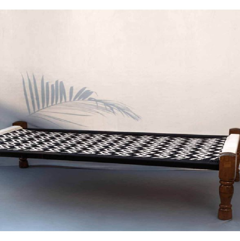 Small charpai with a bright pink and orange diamond woven pattern on dark, turned wood legs, at wholesale prices.