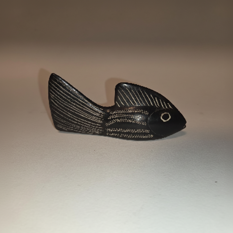 รูปปั้นปลาหินสบู่สีดำขนาดเล็กที่มีครีบแกะสลักและตาที่แตกต่างมีจำหน่ายในราคาขายส่ง