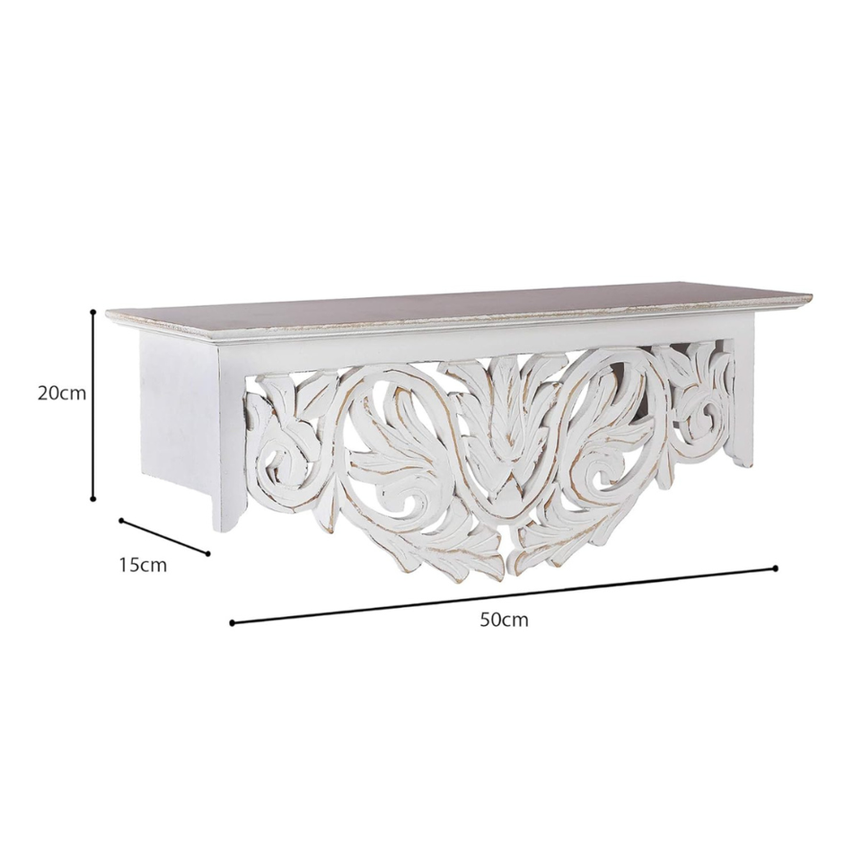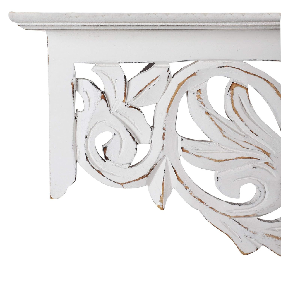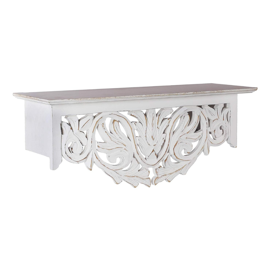 ชั้นวางติดผนังไม้แกะสลักลายศิลป์ สีขาวล้าง ทำจากไม้เอ็นจิเนียร์ สำหรับตกแต่งห้องรับแขกและระเบียง