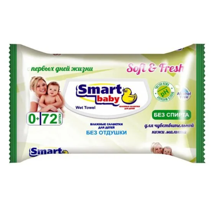 ผ้าเช็ดทำความสะอาดเด็กอ่อน สมาร์ท เบบี้ 72 ชิ้น ปราศจากแอลกอฮอล์ เนื้อนุ่ม สดชื่น ผลิตจากวัสดุไม่ถักทอ