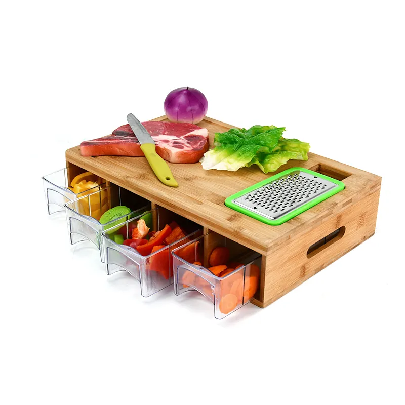 เขียงไม้ไผ่อัจฉริยะพร้อมฝาปิดล็อค4ตู้คอนเทนเนอร์และเครื่องขูดในตัวง่ายต่อการทำความสะอาดสถานีเตรียมอาหารที่มีถาด