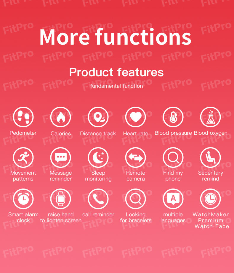 นาฬิกาปลุก, การแจ้งเตือนการโทร, นับถอยหลัง, เครื่องติดตามสุขภาพ, อัตราการเต้นหัวใจติดตาม, ข้อความแจ้งเตือนข้อความ, ข้อความแจ้งเตือนแบบพุช, รีโมทคอนโทรล, เครื่องติดตามการนอนหลับฟังก์ชัน