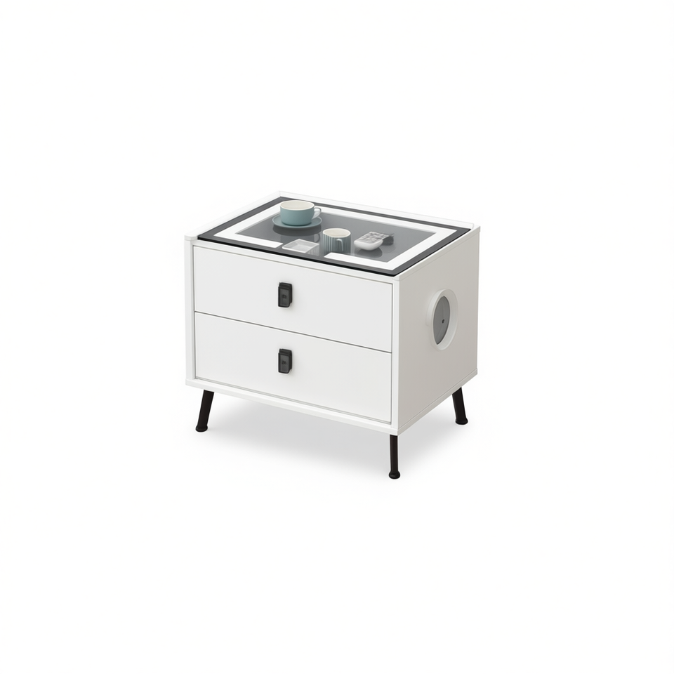 โต๊ะข้างเตียงอัจฉริยะ 50x40x45 ซม. ท็อปกระจกสีขาว 2 ลิ้นชัก ดีไซน์ทันสมัยเรียบง่าย โต๊ะข้างเตียงห้องนอน เฟอร์นิเจอร์บ้าน