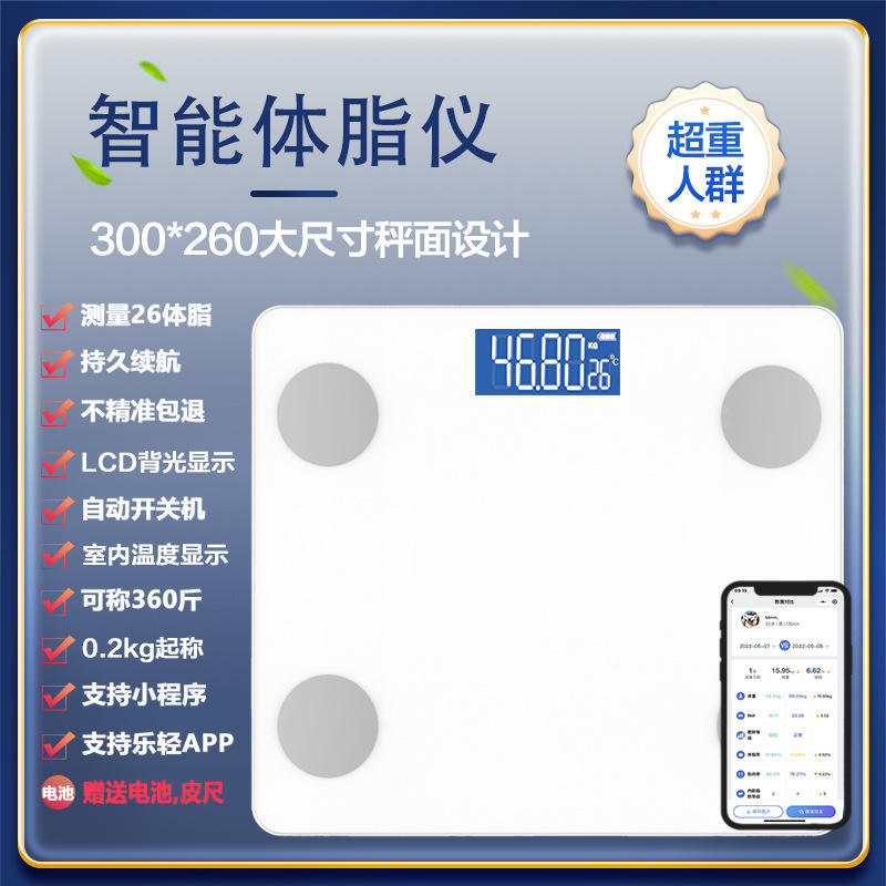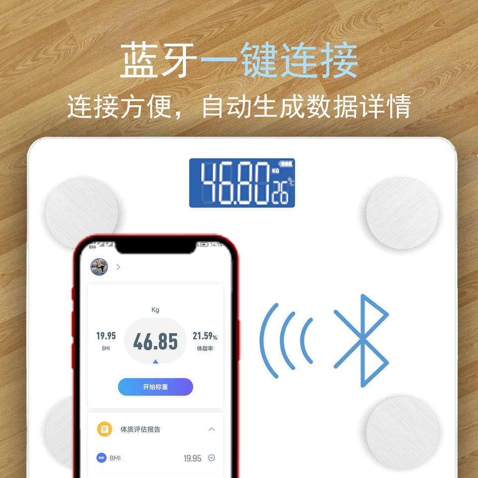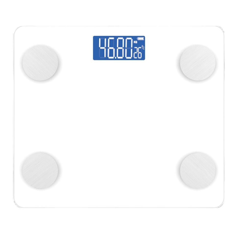 เครื่องชั่งน้ำหนักไขมันในร่างกายแบบสมาร์ทบลูทูธทรงสี่เหลี่ยมผืนผ้าสีขาว 30x26 ซม. สำหรับผู้ใหญ่ ความแม่นยำสูง ใช้พลังงานจากแบตเตอรี่