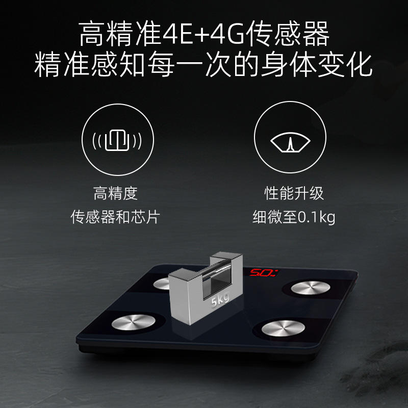เครื่องชั่งน้ำหนักอัจฉริยะแบบดิจิตอลอิเล็กทรอนิกส์พร้อมบลูทูธ เซ็นเซอร์ความแม่นยำสูงสำหรับใช้ในบ้าน รูปทรงสี่เหลี่ยม ใช้พลังงานจากแบตเตอรี่