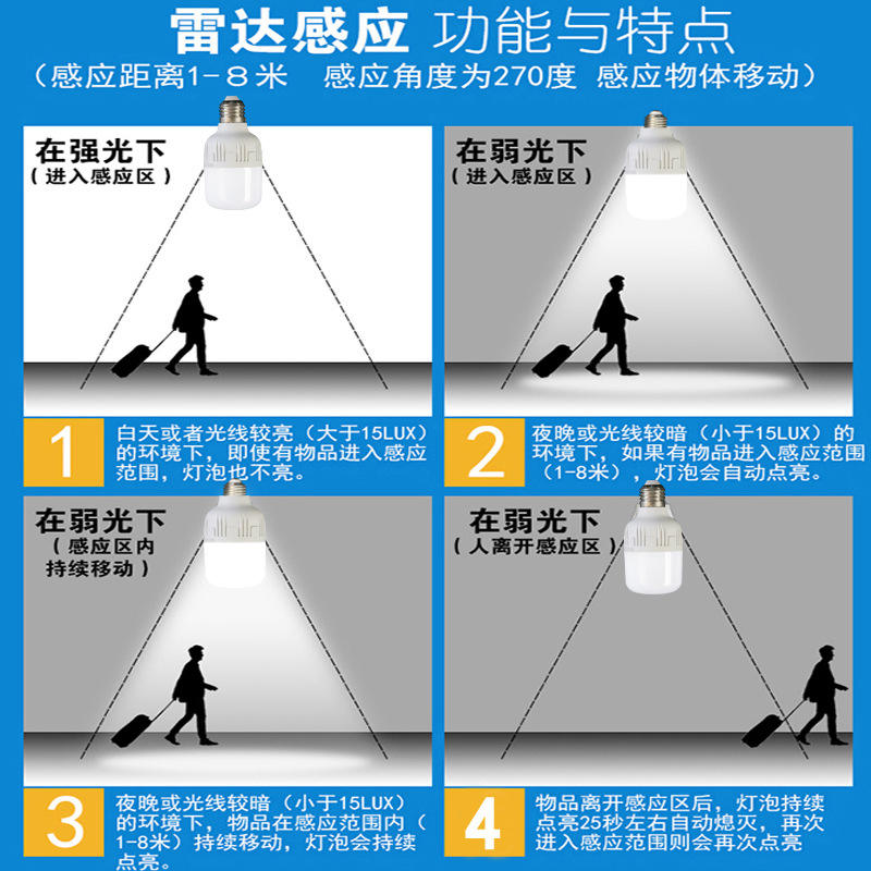 หลอดไฟอัจฉริยะ LED E27 ระบบควบคุมแสงด้วยเสียง เซ็นเซอร์เรดาร์ ไฟทางเดิน โถงทางเดิน บันได ระบบอัตโนมัติอัจฉริยะ