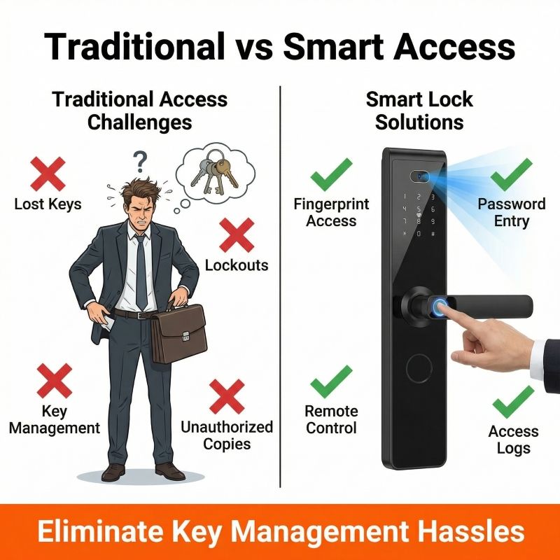 การจดจำใบหน้า, รหัสผ่าน, กุญแจ, ลายนิ้วมือ, บัตร, แอปควบคุม