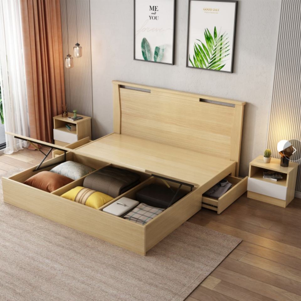 โครงเตียงคู่ขนาดควีนไซส์/คิงไซส์ ดีไซน์ทันสมัย ชุดเฟอร์นิเจอร์ห้องนอนเด็ก วัสดุเอ็มดีเอฟ พร้อมที่เก็บของในตัว โครงเตียงไม้จริง