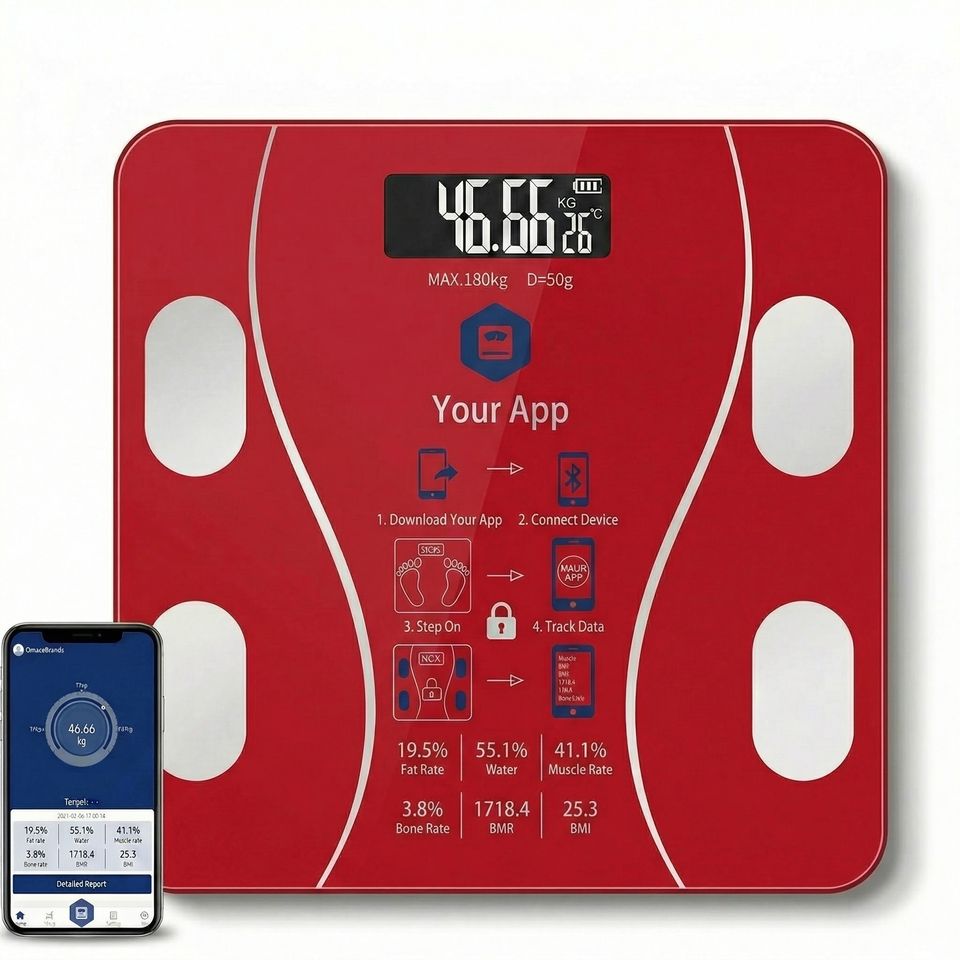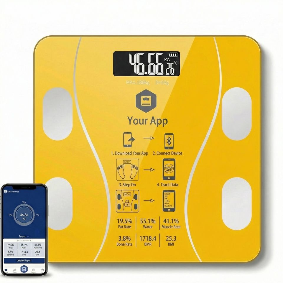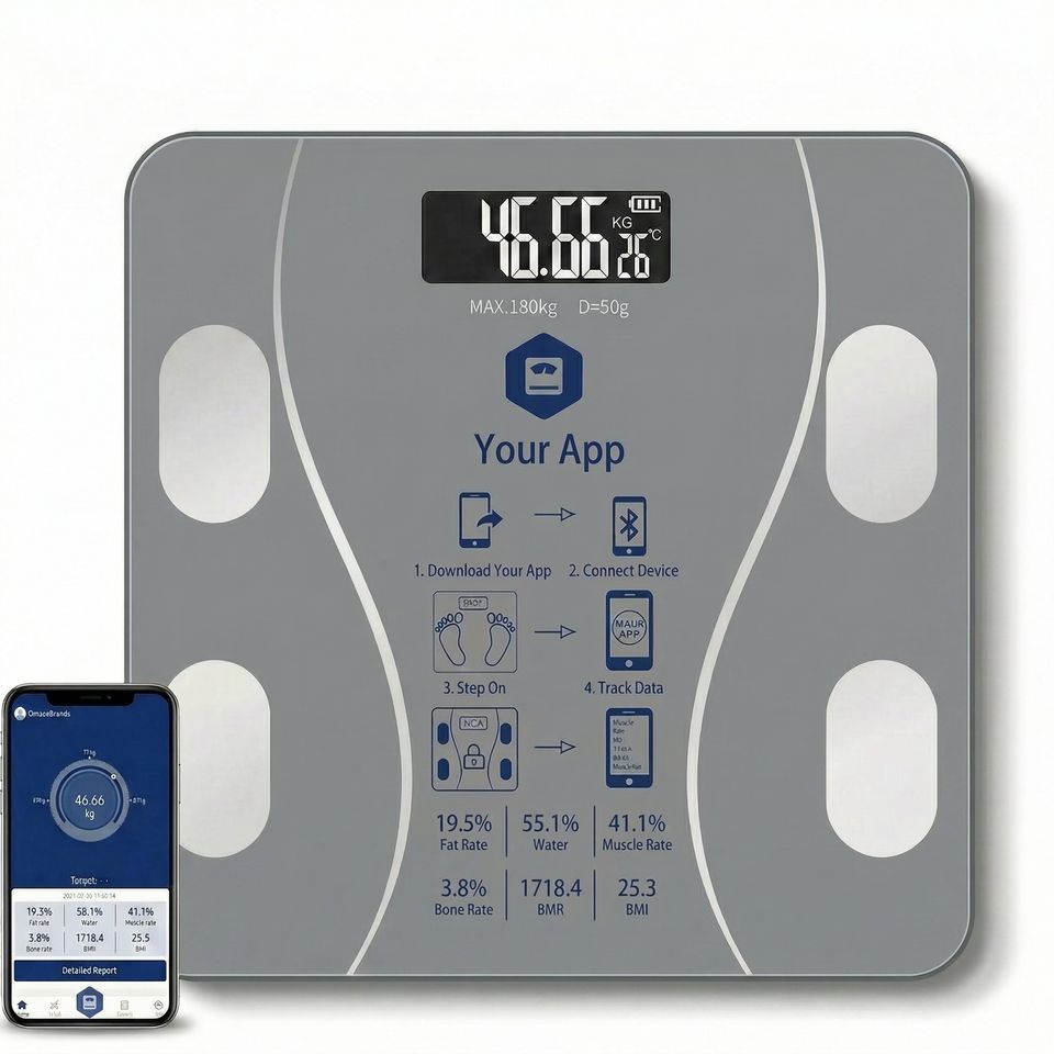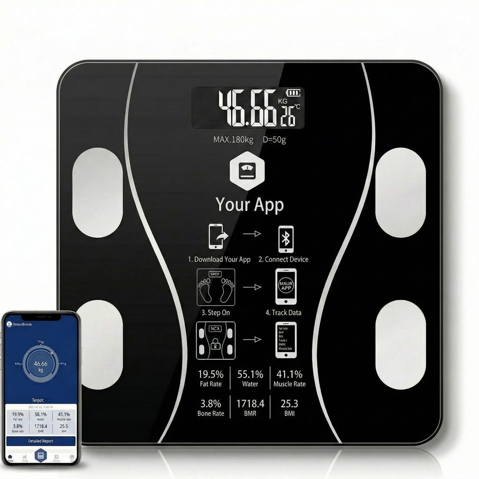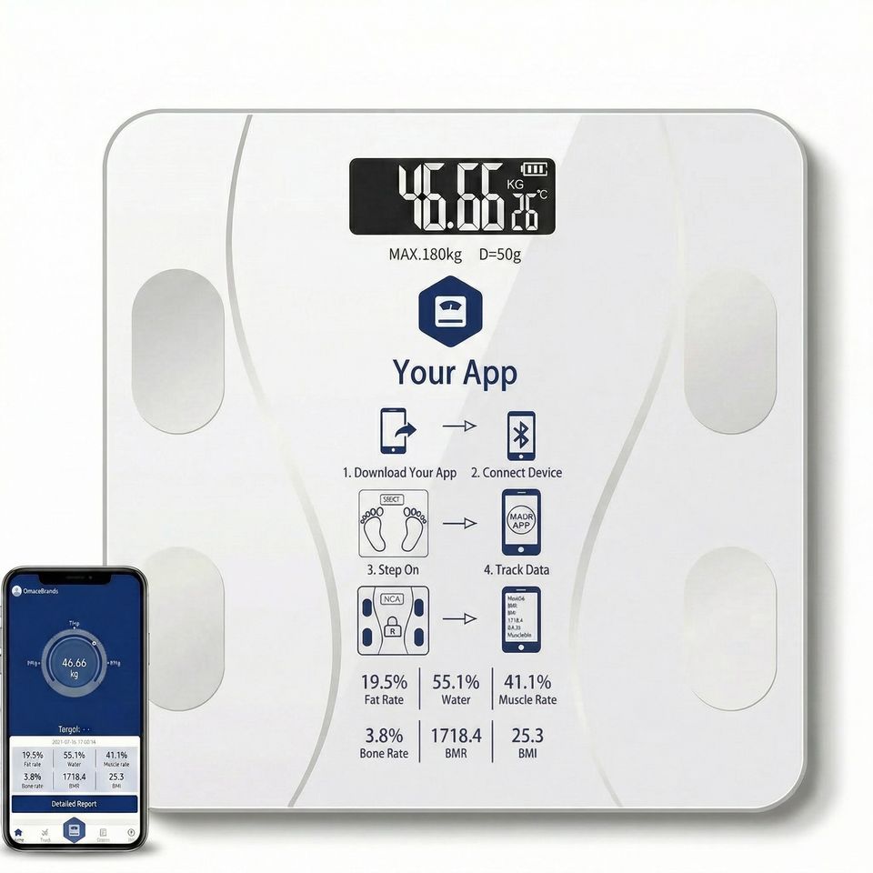 เครื่องชั่งน้ำหนักดิจิตอลอัจฉริยะพร้อมเซ็นเซอร์กระจกอิเล็กทรอนิกส์ รองรับน้ำหนักได้ 180 กก. วัดค่าดัชนีมวลกาย (BMI) และไขมันในร่างกาย ควบคุมผ่านแอปพลิเคชัน พกพาสะดวก ใช้ได้ทั้งในห้องน้ำและนอกบ้าน