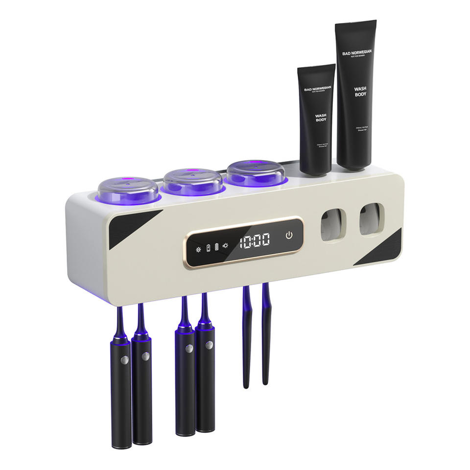 ที่วางแปรงสีฟันอัจฉริยะพร้อมแสงยูวีและหน้าจอดิจิตอล สีเบจ-เทาเข้ม ติดตั้งด้วยถ้วยดูดสุญญากาศสำหรับแปรงสีฟันไฟฟ้า