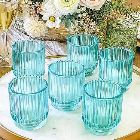 แก้วสีฟ้าควันแบบวินเทจยางแก้วทีไลท์เชิงเทียนเชิงเทียน (ชุด6ชิ้น) ของตกแต่งฤดูใบไม้ร่วงของตกแต่งชั้นวางของแนวโบโฮ