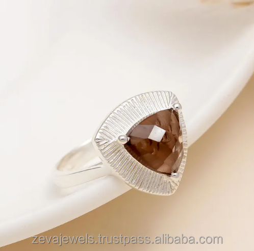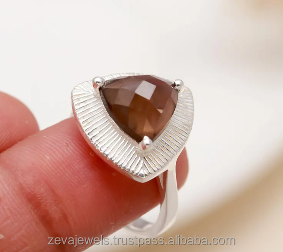 แหวนควอทซ์สโมคกี้ทรงสามเหลี่ยมกรอบพื้นผิวเครื่องประดับวินเทจ