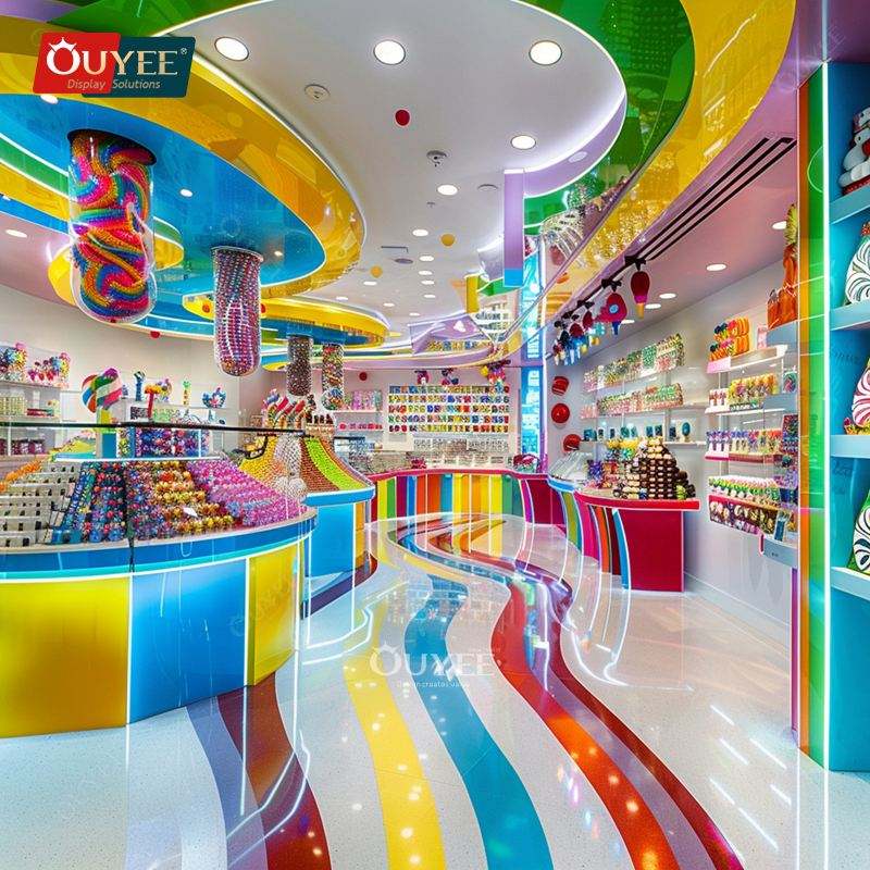 ชั้นวางแสดงขนมสำหรับตกแต่งร้านขายขนมแบบสั่งทำสำหรับวางช็อคโกแลตเคาน์เตอร์ขนมขบเคี้ยว