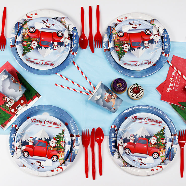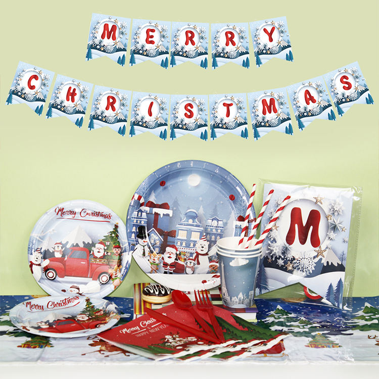 Snow Santa Claus Party Tableware Four-piece Set Merry Christmas Theme Paper Plates Set for 8 Guests