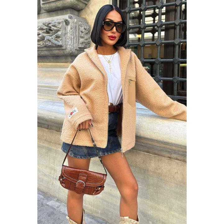 เสื้อแจ็คเก็ตขนเฟอร์เทียม Sobe สำหรับผู้หญิง เสื้อโค้ทขนแกะอุ่นสบาย สีคาเมล บุด้วยโพลีเอสเตอร์ ดีไซน์ซิปเต็มตัว