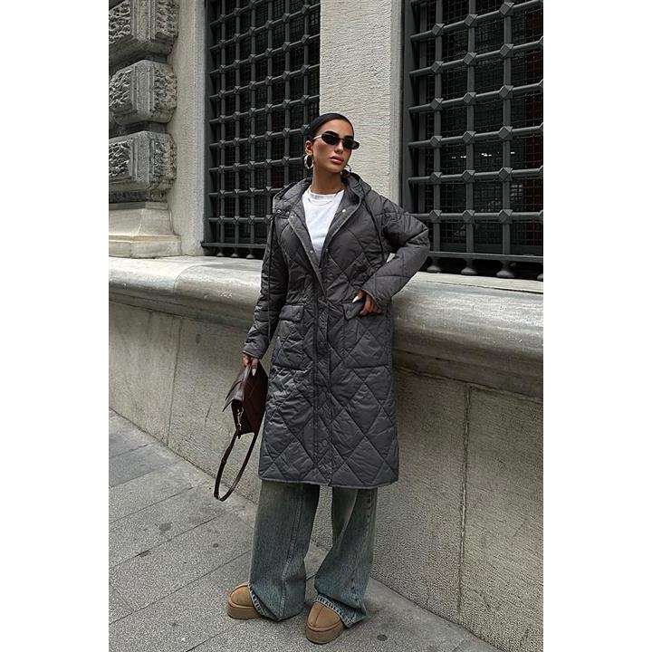 เสื้อโค้ทโซเบ ลอง ควิลท์สีเทา แขนยาว ผลิตจากเส้นใยโพลีเอสเตอร์ทอ ให้ความอบอุ่น สวมใส่สบาย เหมาะสำหรับผู้หญิง
