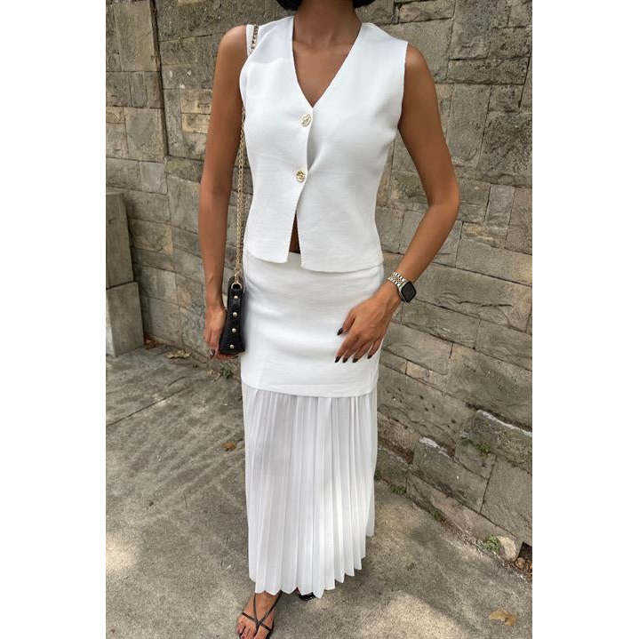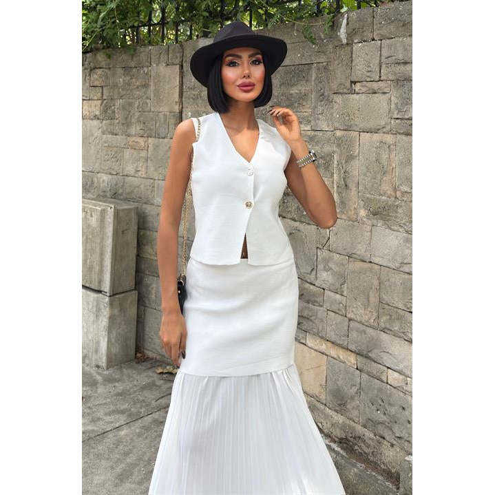 ชุดเสื้อกั๊กถักและกระโปรงจีบสำหรับผู้หญิง แบรนด์ Sobe สวมใส่สบายในฤดูร้อน ระบายอากาศได้ดี สีเอครูม ทรงมาตรฐาน