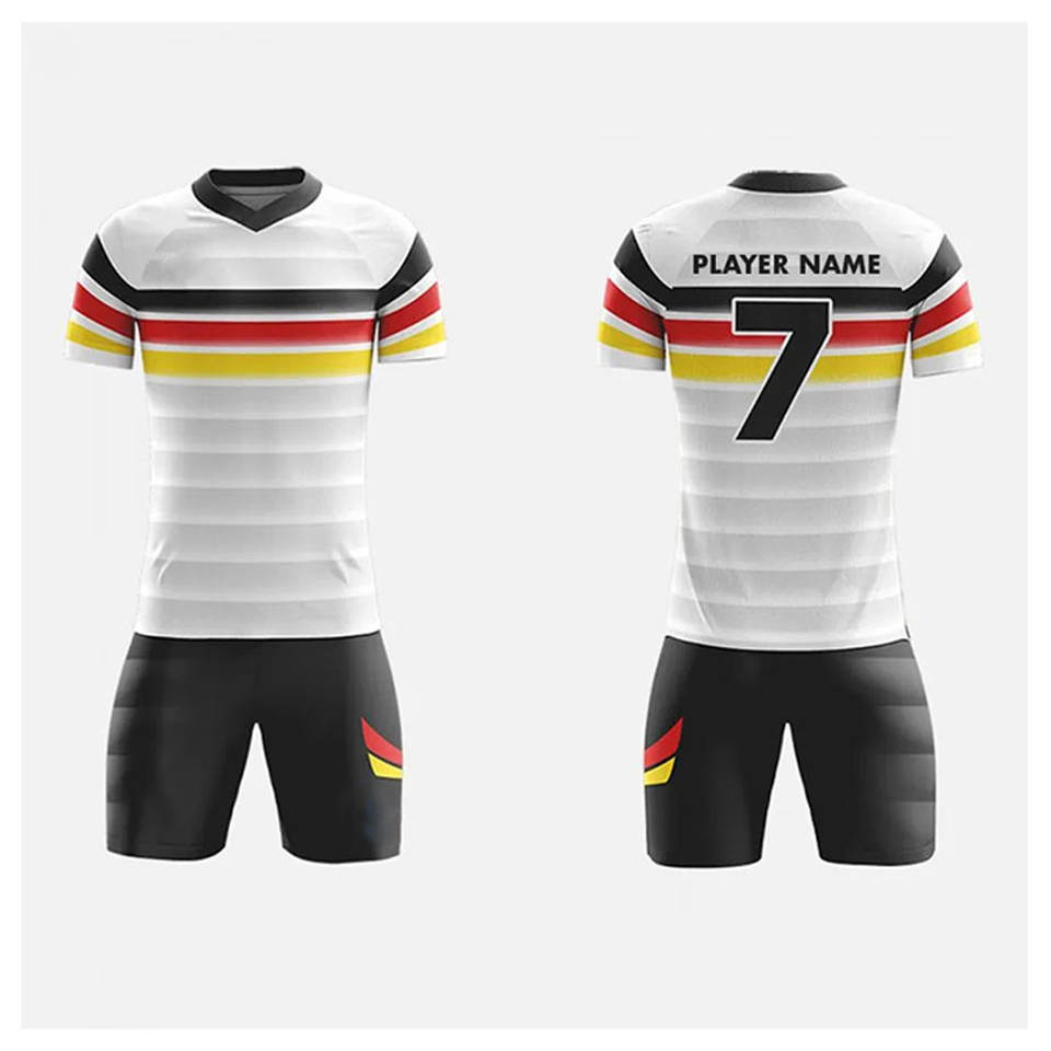 ชุดเสื้อเจอร์ซีย์ฟุตบอลระบายอากาศน้ำหนักเบาพร้อมกางเกงขาสั้นชุดทีมชุดกีฬาพรีเมียมออกแบบโลโก้ได้ตามต้องการ
