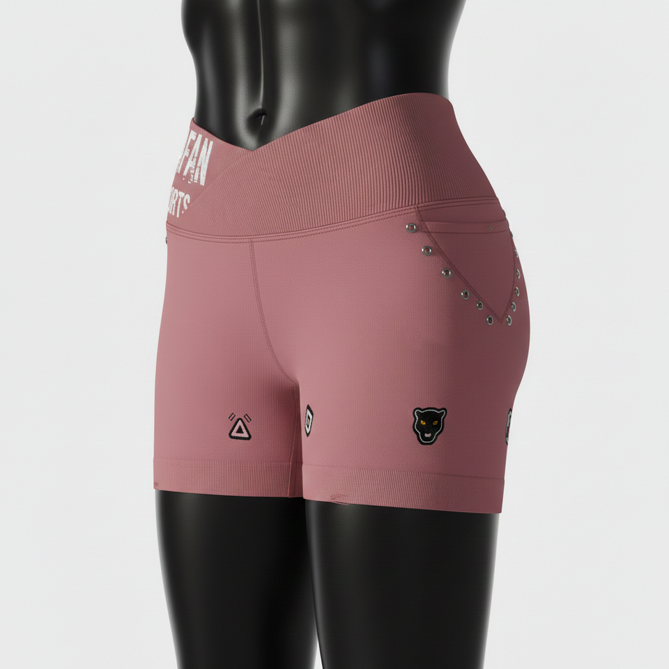 ผ้าสแปนเด็กซ์โพลีเอสเตอร์เนื้อนุ่ม 230 GSM สีชมพูอมเทา แบบขาสั้น ยืดหยุ่นได้ เอวแบบริบไขว้ พร้อมป้ายโลโก้แบบสั่งทำ