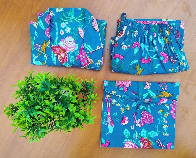 ชุดนอนผ้าฝ้ายพิมพ์ลายดอกไม้สำหรับผู้หญิงชุดนอนผ้านุ่มใส่สบายสำหรับฤดูร้อนพร้อมเสื้อเชิ้ตและกางเกงชุดกลางคืน