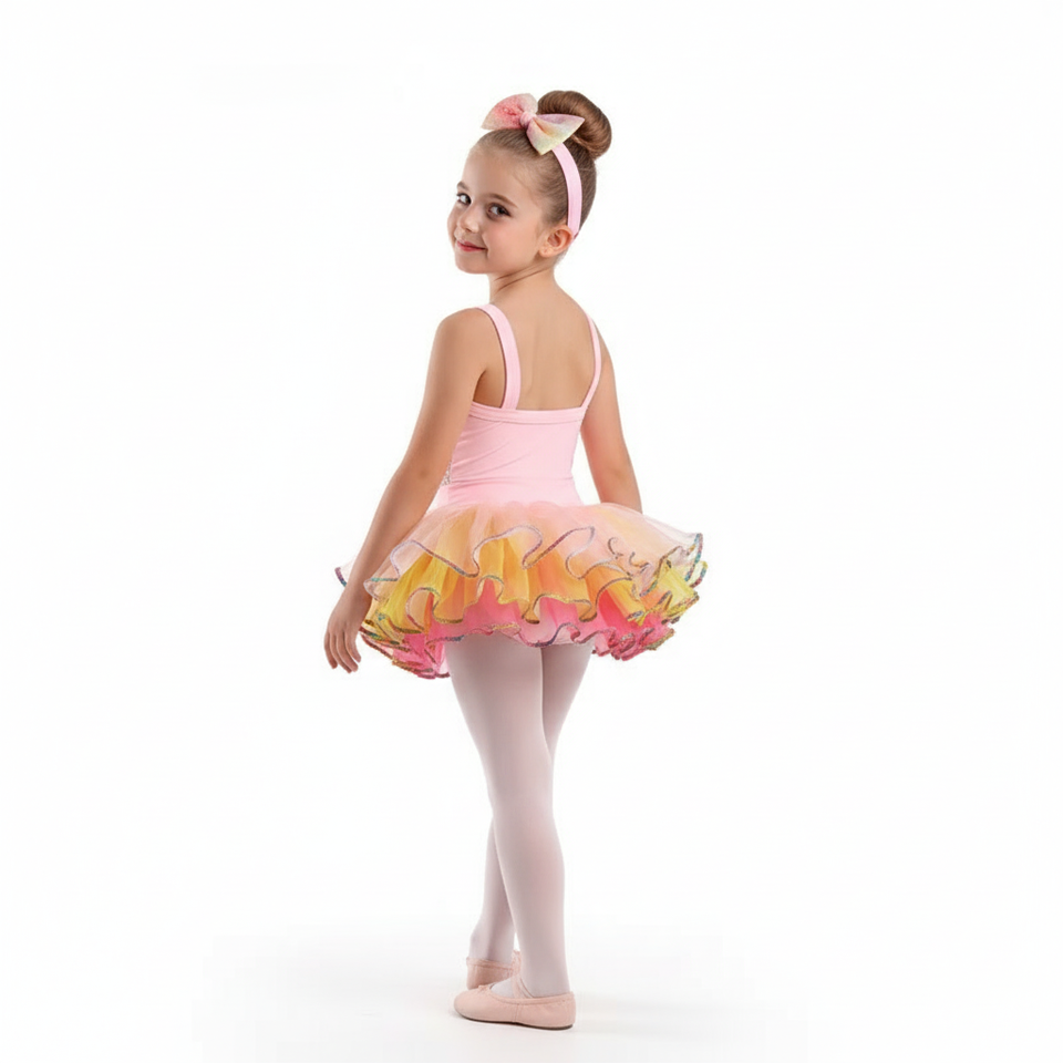 ชุดบัลเลต์เด็กสีพาสเทลไล่เฉดสีพร้อมขอบสีรุ้ง ชุดเต้นแจ๊สพร้อมที่คาดผมโบว์เข้าชุด เหมาะสำหรับการเต้นและการงานปาร์ตี้