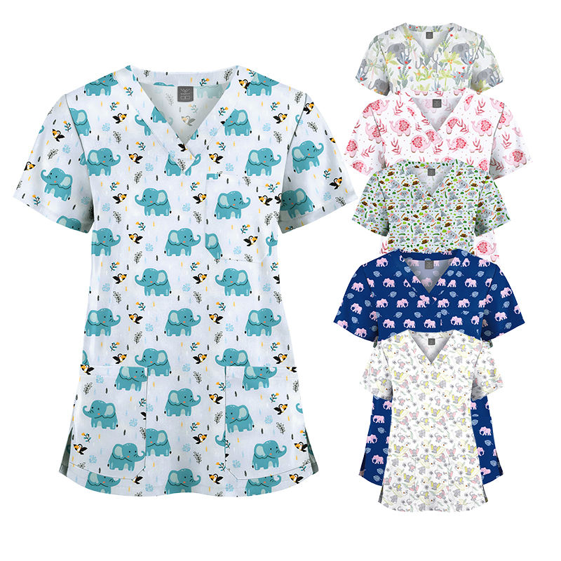 เสื้อคอวีสำหรับผู้หญิงพิมพ์ลายหมีเสื้อสครับคอวีมีกระเป๋าชุดทำงานใส่สบาย