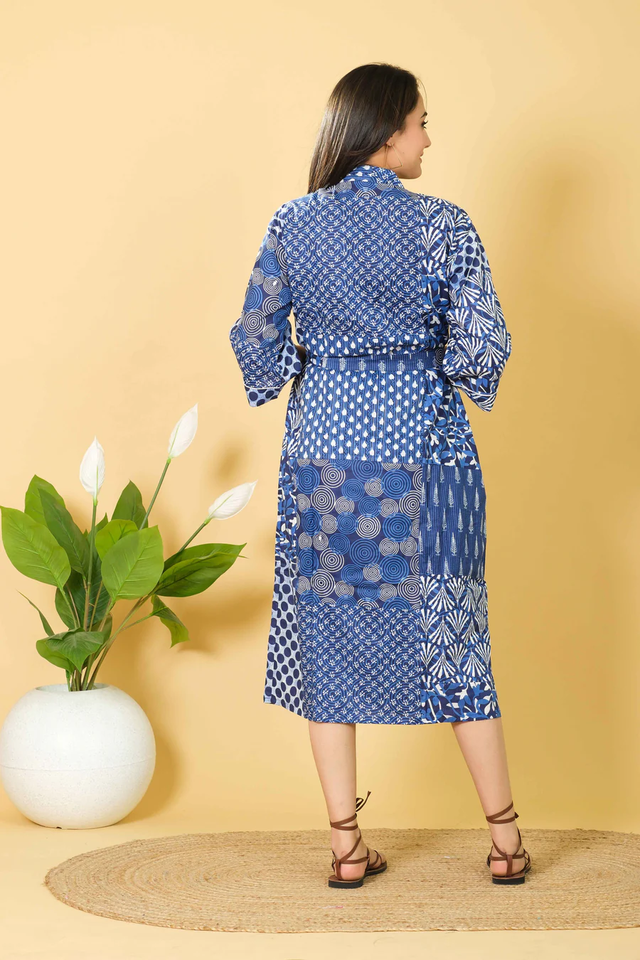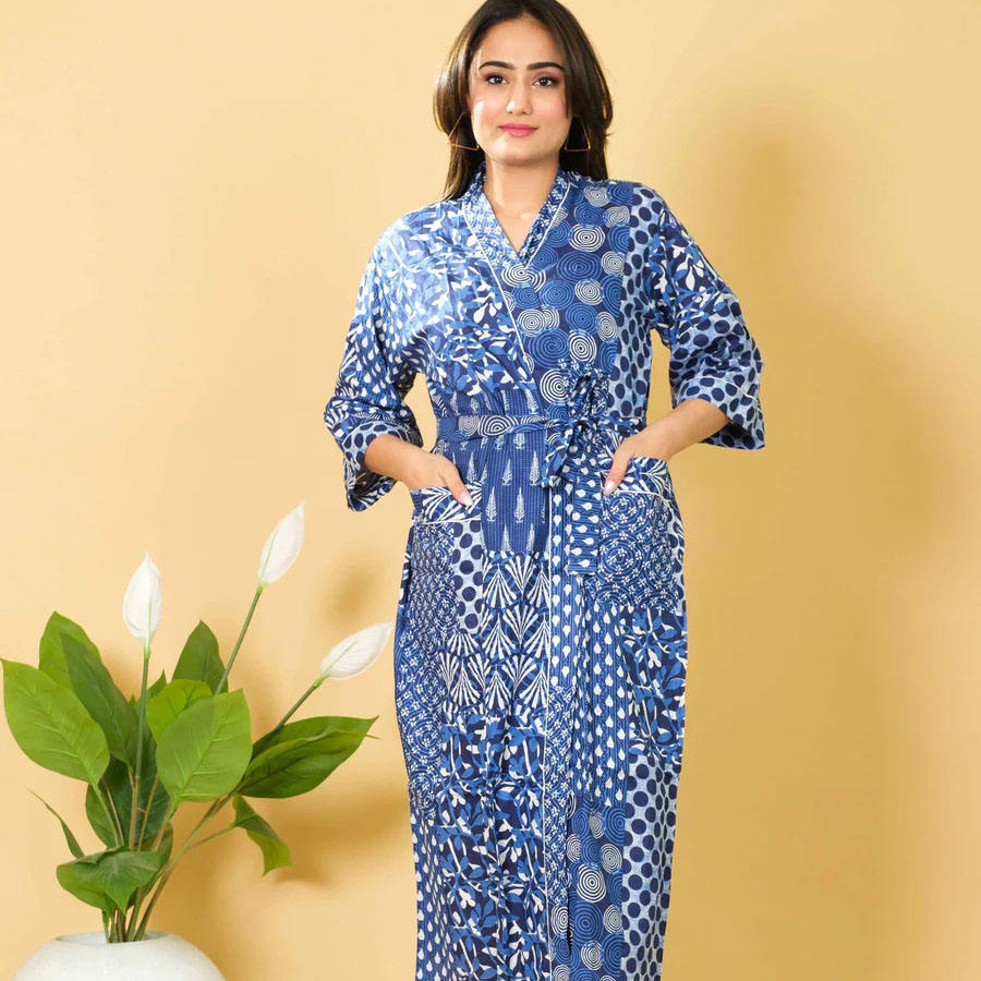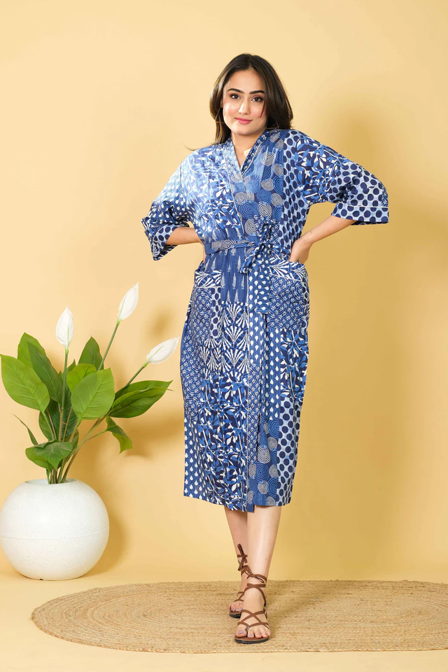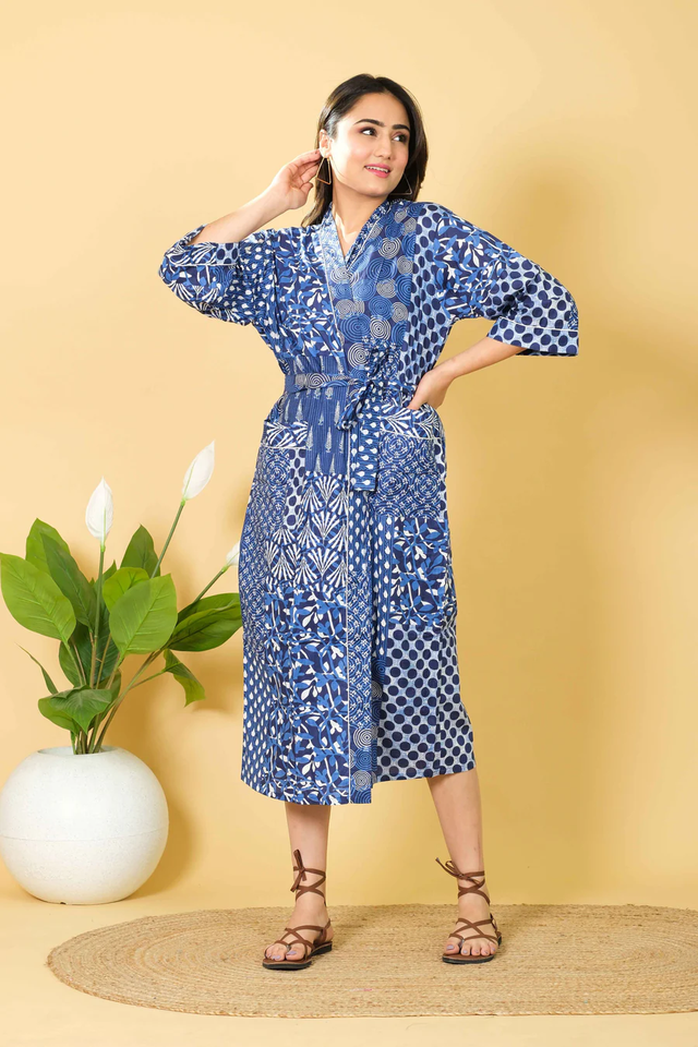 เสื้อคลุมอาบน้ำผ้าฝ้ายเนื้อนุ่มพิมพ์ลายสำหรับผู้หญิงชุดคลุมเอวสีครามพร้อมชุดกิโมโนยาวถึงเข่าสำหรับฤดูร้อน
