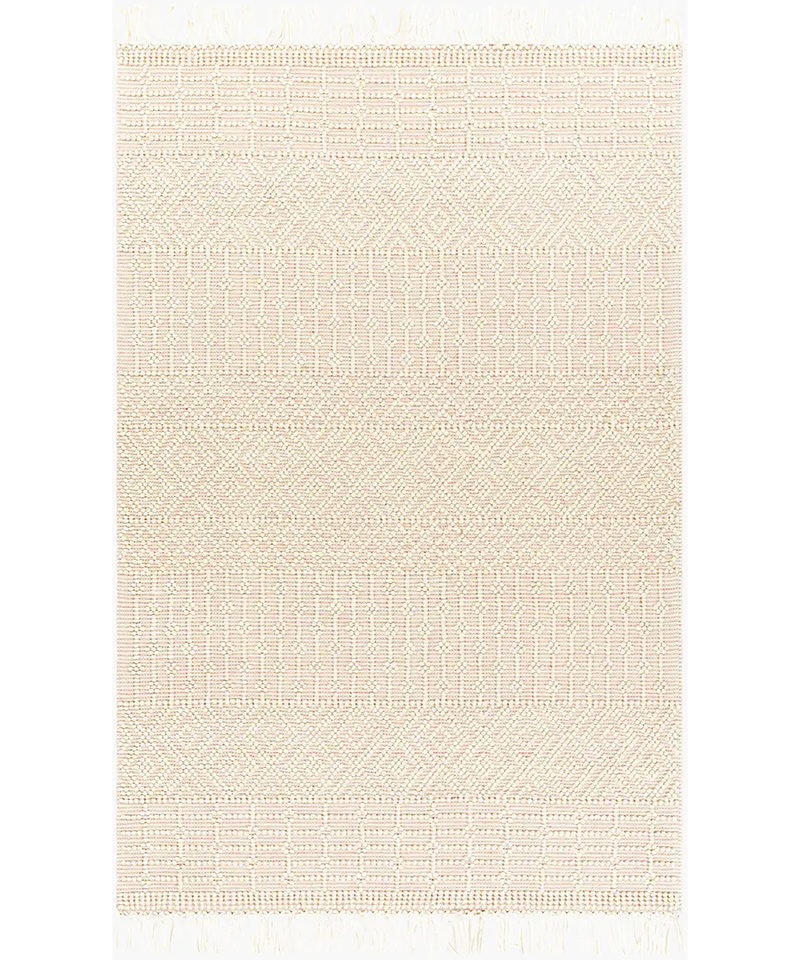 พรมขนสัตว์ทอมือที่นุ่มและทนทานสีเบจที่มีลวดลายเรขาคณิตและลายทางที่แตกต่างกันทำให้พื้นนุ่มสบายและมีสไตล์