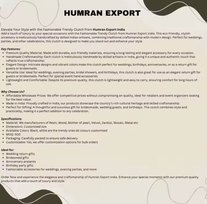 สไตล์:แฟชั่น, ทันสมัย, คลาสสิก, สง่างาม, ปาร์ตี้, คลัทช์