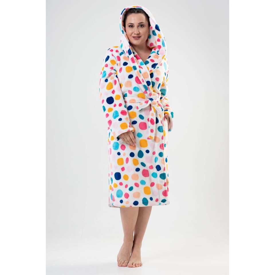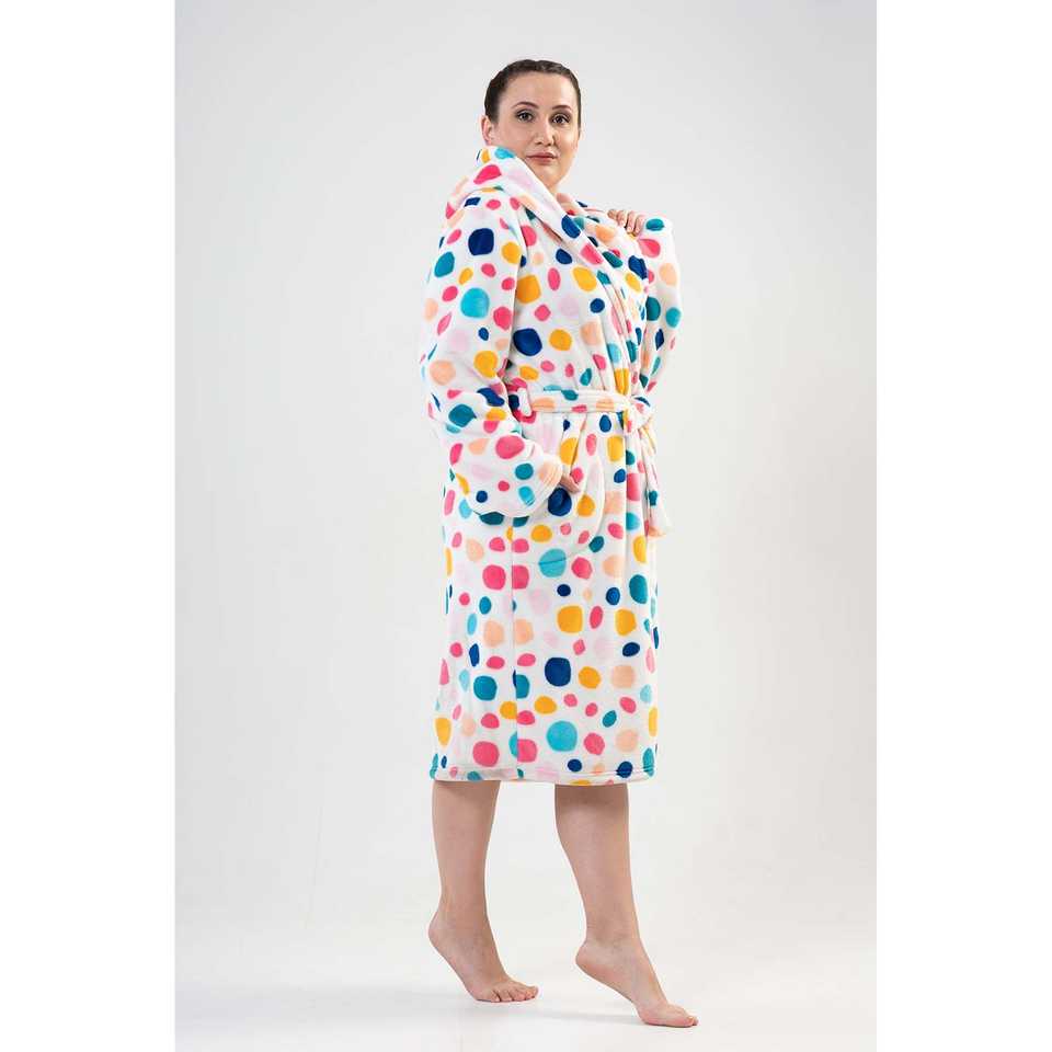 เสื้อคลุมมีฮู้ดแขนยาวผ้าฟลีซเนื้อนุ่มสำหรับผู้หญิงพร้อมลายจุดสีสันสดใสชุดนอนลำลองสีขาวขนาดใหญ่