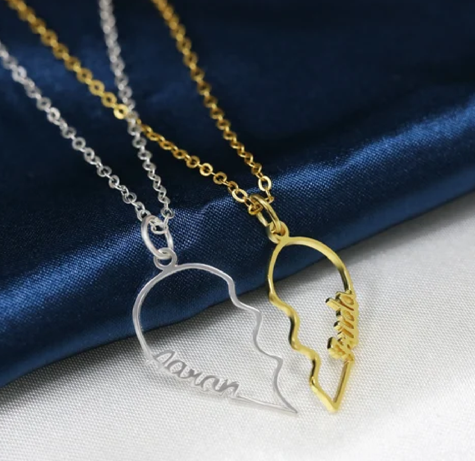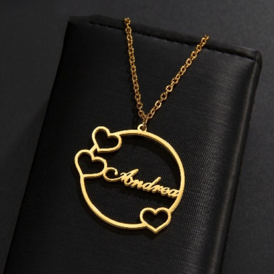 จี้วงกลมสีทองอ่อนพร้อมหัวใจสามดวงและสลักชื่อไว้ตรงกลางเครื่องประดับสำหรับผู้หญิงและผู้ชายราคาถูกในอินเดีย