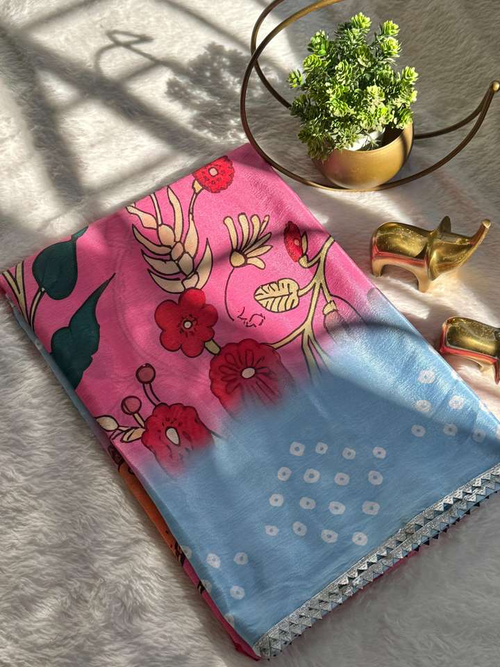 ผ้าไหมมาห์มาลีเนื้อนุ่มสำหรับผู้หญิง ผ้าส่าหรีอินเดียลายคัลมาการีสวยงาม พร้อมขอบลูกไม้ลายแบนดานีสีเงิน มีสินค้าพร้อมส่ง