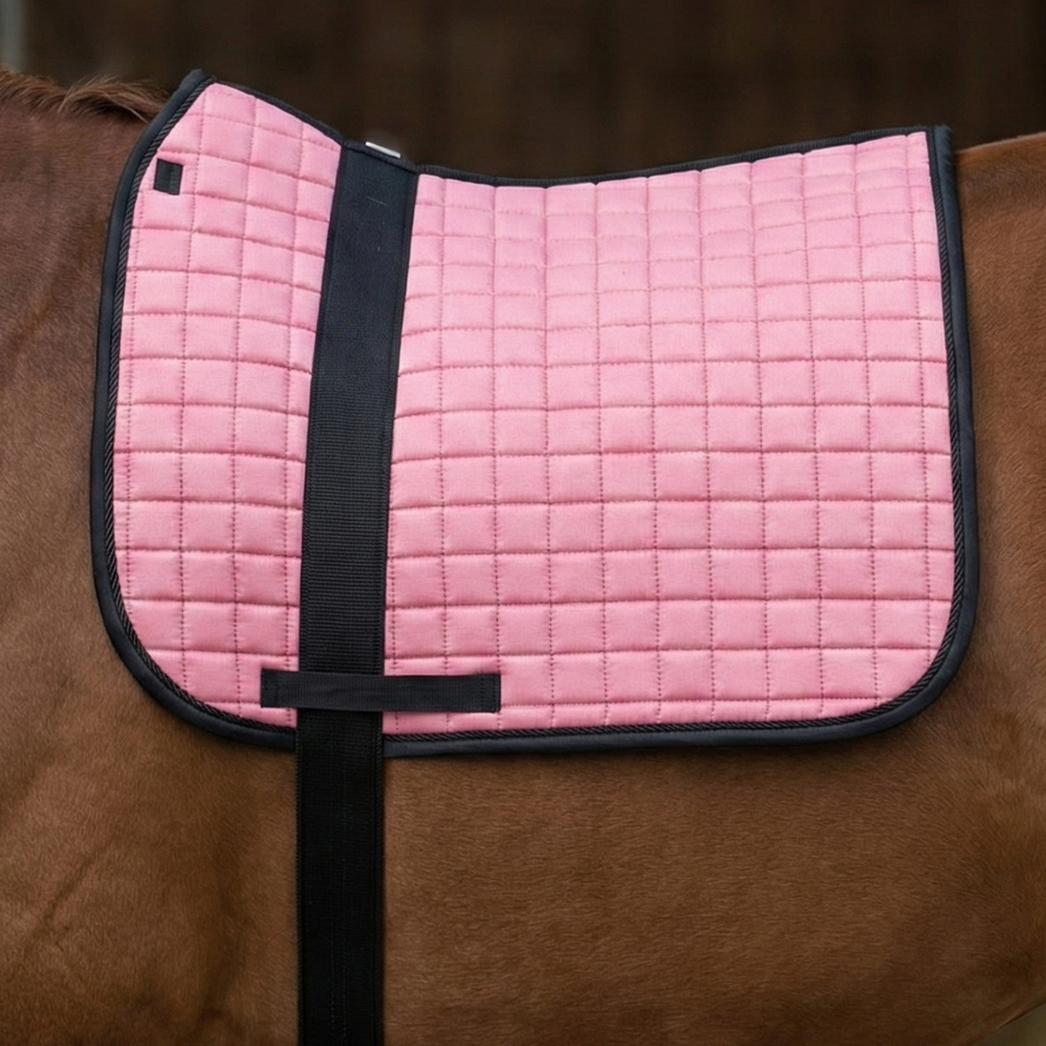 แผ่นรองอานม้าแบบควิลท์สีชมพูอ่อน บุด้วยตาข่าย บรรจุใยโฟมและใยฝ้าย รูปทรงโค้งตามหลักสรีรศาสตร์ พร้อมสายรัดสำหรับขี่ม้า