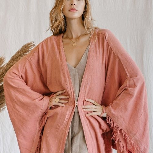 ชุดคลุมกิโมโนสีชมพูอ่อนสไตล์โบฮีเมียนสำหรับแขกงานแต่งงาน แขนกว้างทรงโอเวอร์ไซส์ เหมาะสำหรับใส่คลุมชุดบิกินี่ในฤดูใบไม้ผลิ