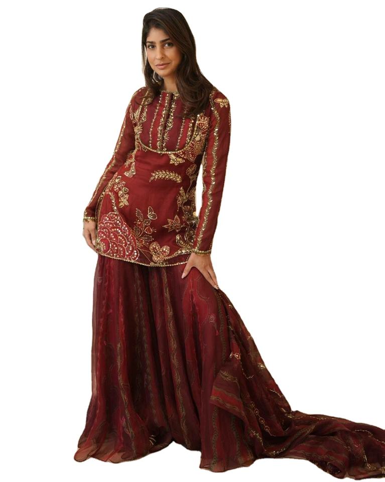 ผ้าไหมออร์แกนซ่าเนื้อนุ่มบริสุทธิ์ ตกแต่งด้วยงานปักและกระจกหลากหลายแบบ ไซส์ M ถึง XXL ชุดสัลวาร์ คามีซ ตัดเย็บตามสั่งโดยดีไซเนอร์ พร้อมผ้าคลุมไหล่
