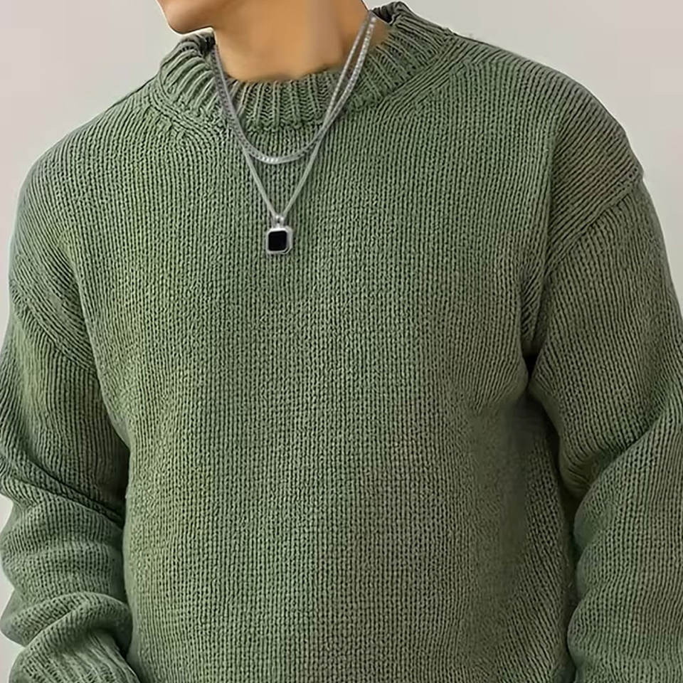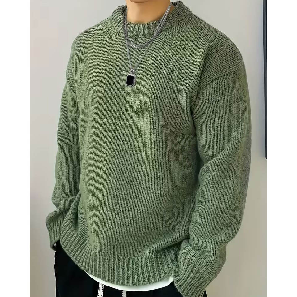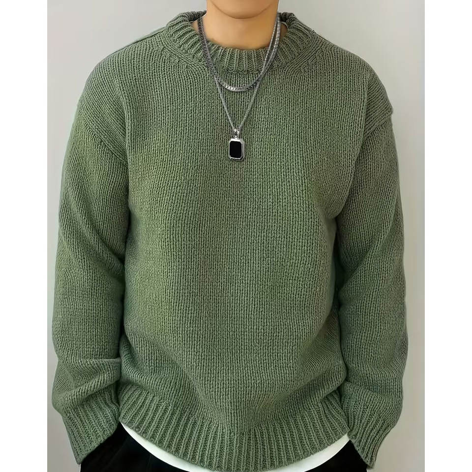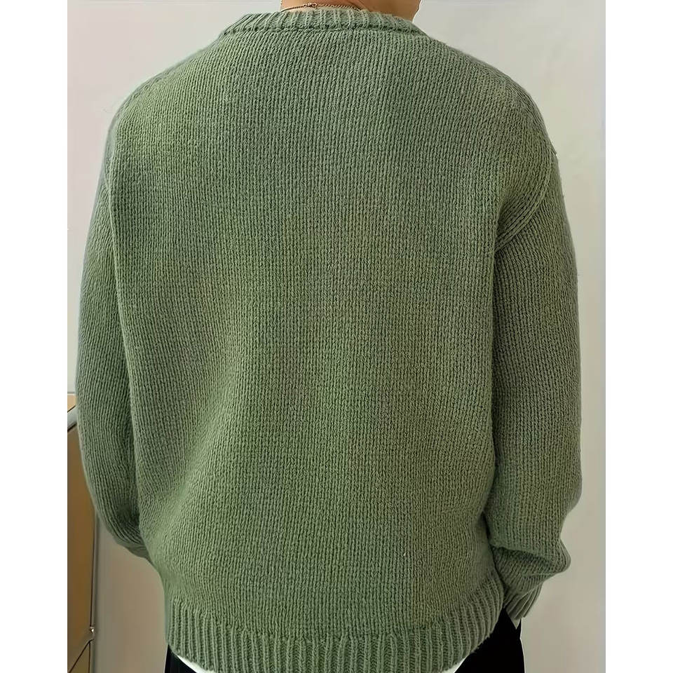 เสื้อไหมพรมแขนยาวคอกลมเนื้อนุ่มสำหรับผู้ชาย สวมใส่สบายในฤดูหนาว สีพื้น มีโลโก้ด้านหน้า