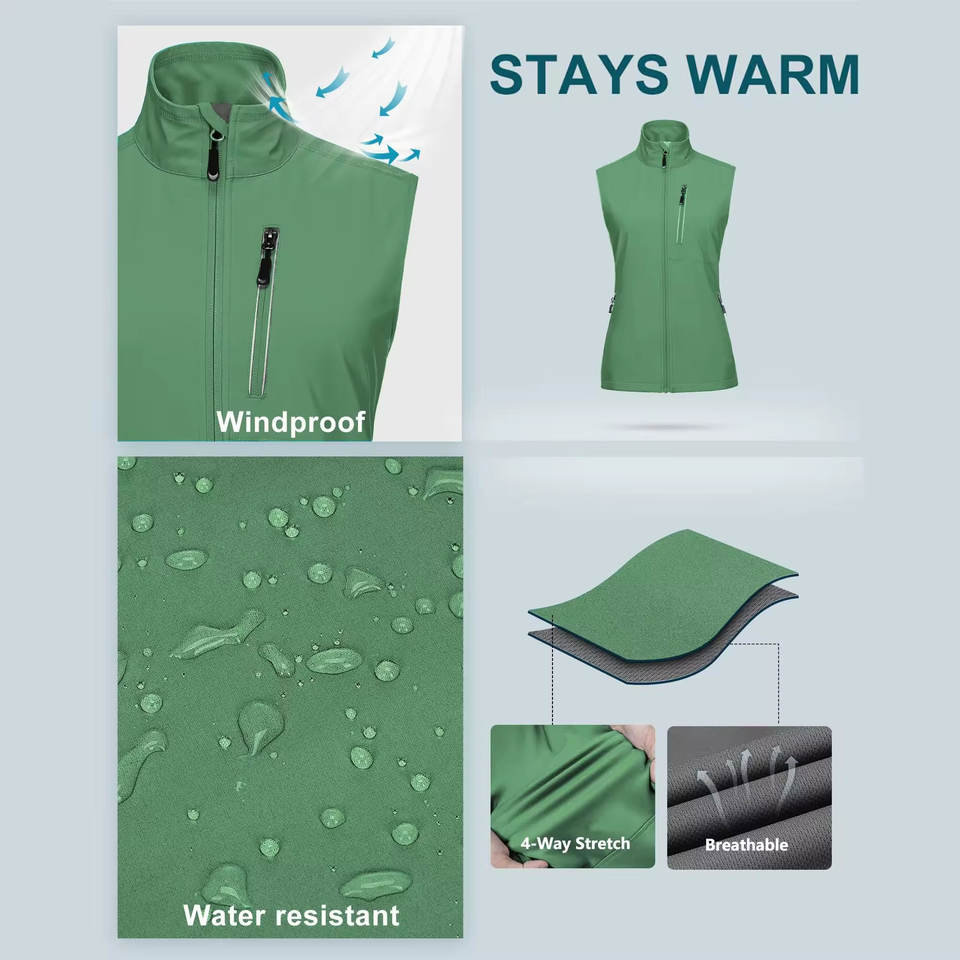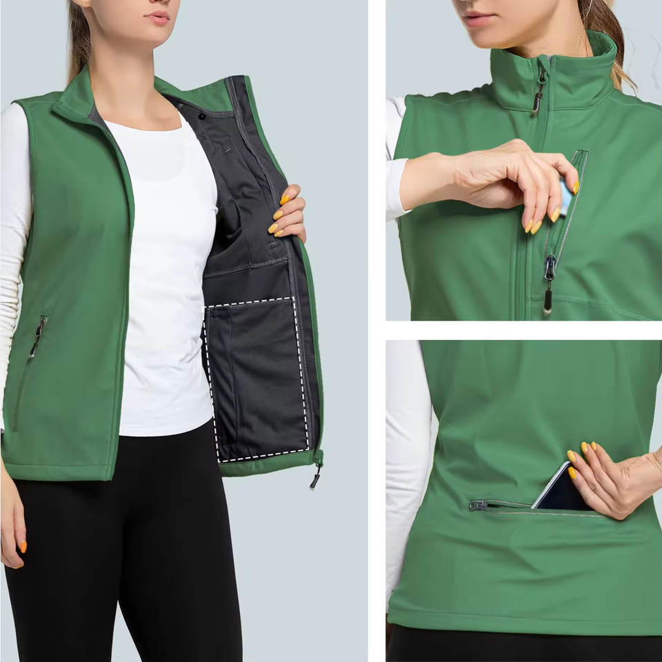 เสื้อกั๊กซอฟท์เชลล์สำหรับผู้หญิง ระบายอากาศได้ดี สีทึบ แห้งเร็ว ไม่มีแขน คอตั้ง เสื้อกั๊กซอฟท์เชลล์คุณภาพสูงสำหรับผู้หญิง