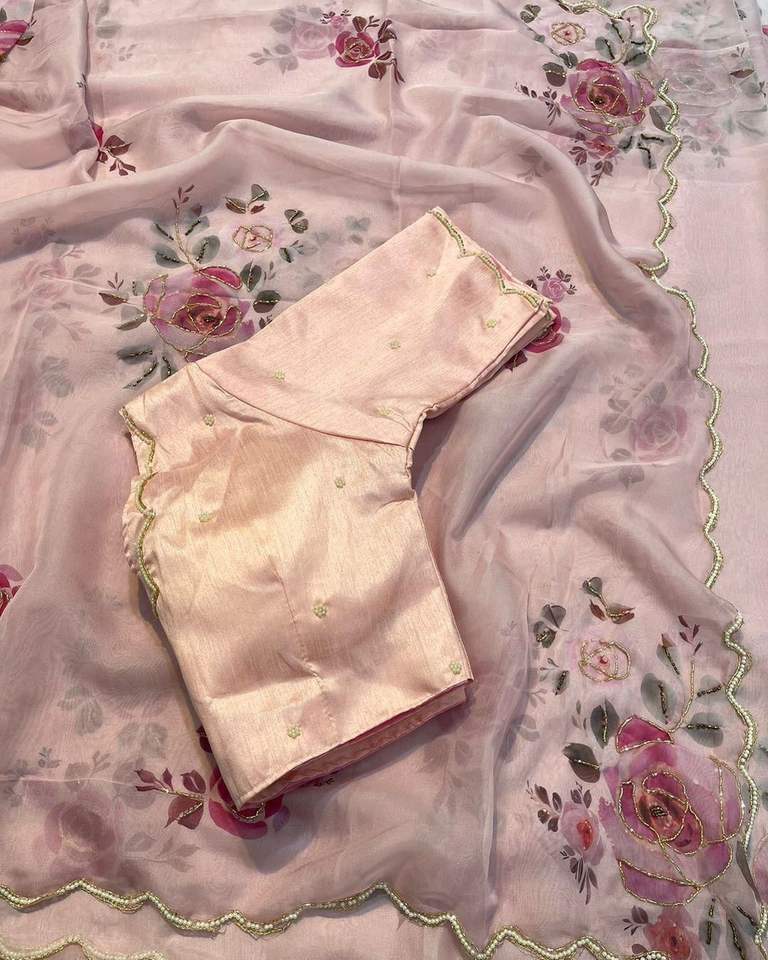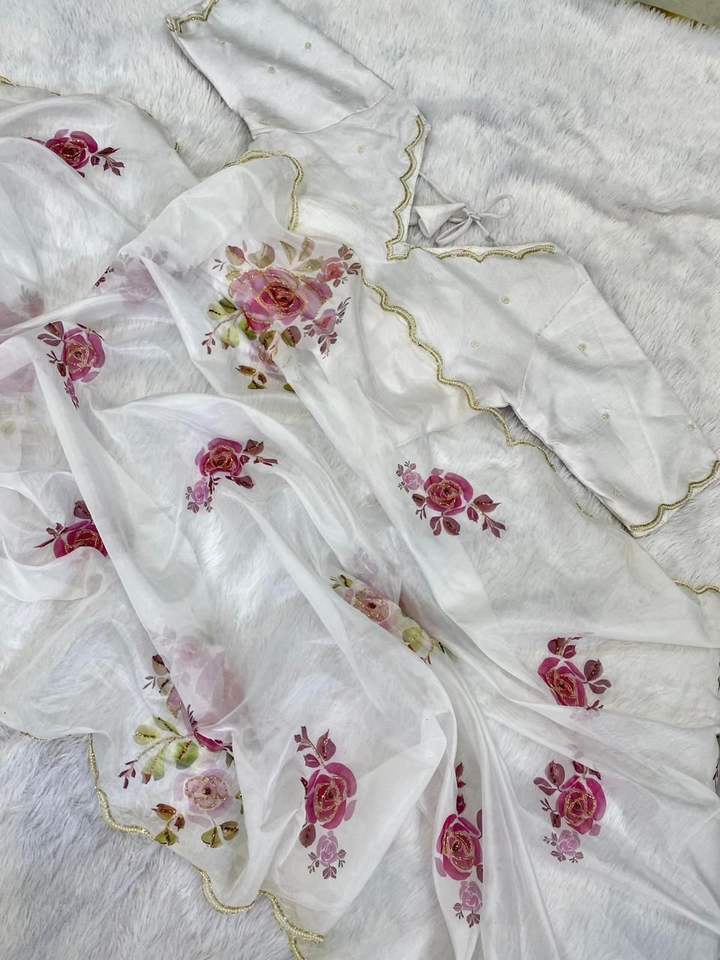 ผ้าซิลค์ซาตินออร์แกนซ่าเนื้อนุ่มพร้อมลายดอกไม้พิมพ์มือและสีมุก ตกแต่งขอบด้วยงานฝีมือเดนา สำหรับผู้หญิงใส่ไปงานปาร์ตี้