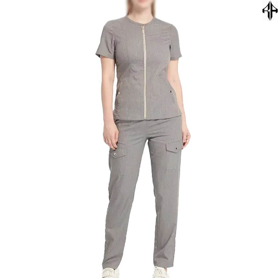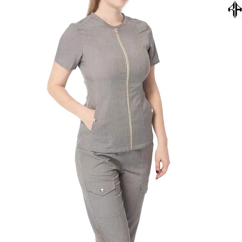 ชุดสครับแพทย์ผ้าทอเนื้อนุ่ม ขายส่ง ทรงพอดีตัว ชุดยูนิฟอร์มพยาบาล ปรับแต่งได้ แขนสั้น ชุดสครับซิปสำหรับโรงพยาบาล ผู้หญิง