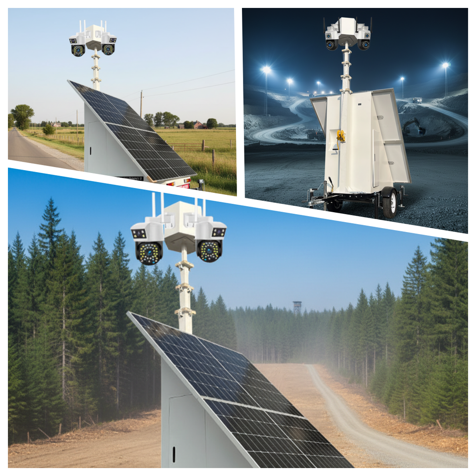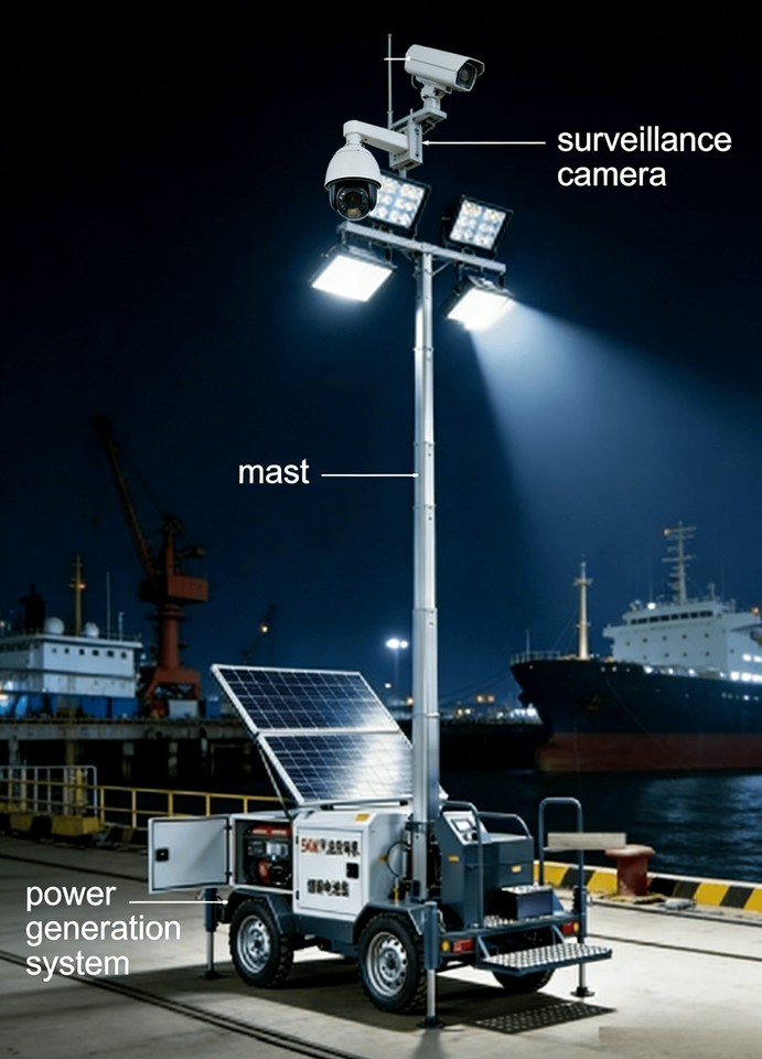 เสาไฟเคลื่อนที่พลังงานแสงอาทิตย์พร้อมกล้องวงจรปิด LED 8x200W สำหรับสถานที่อุตสาหกรรมและพื้นที่ห่างไกล