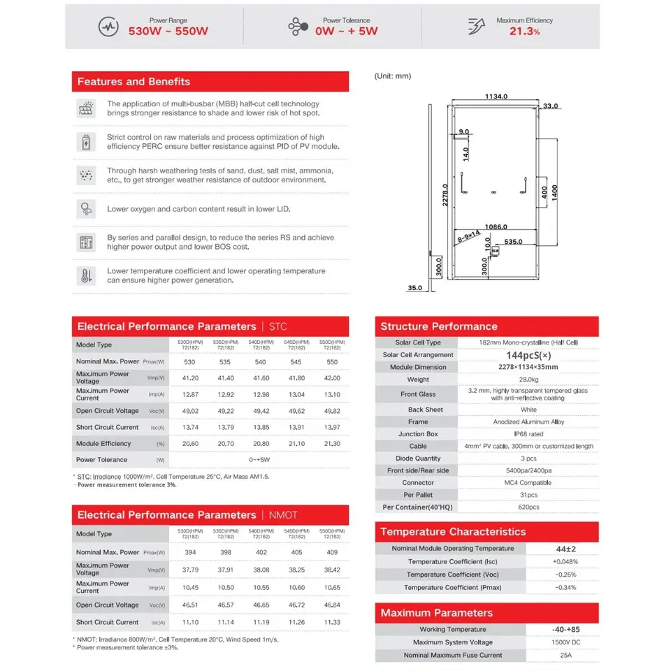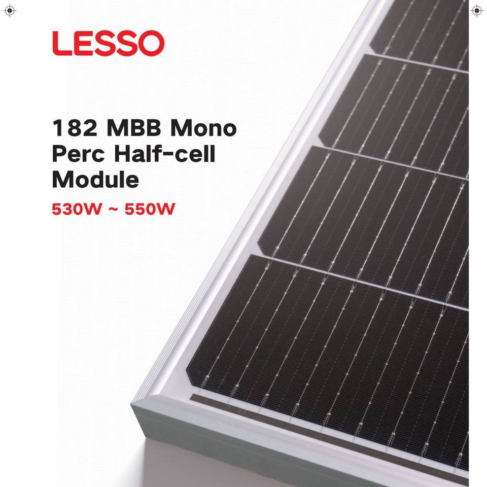 แผงโซลาร์เซลล์ 550 วัตต์ โมโนคริสตัลไลน์ กำลังไฟสูง สำหรับใช้ในบ้าน ระบบประสิทธิภาพสูง โมดูลเซลล์แสงอาทิตย์ ขนาดเซลล์ 182 มม. ขนาด 2278x1134 มม. ยี่ห้อ Lesso